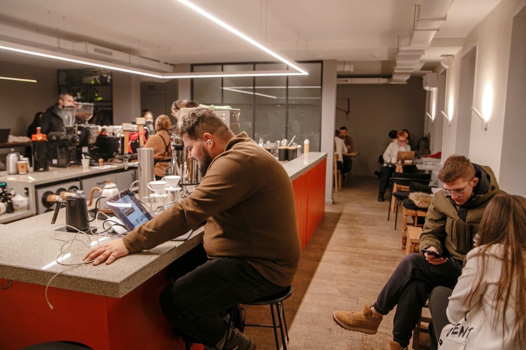 Эта сеть приучила нас и к спешелти кофе, и к тому, что здесь можно спокойно поработать. Самая большая локация представляет собой полноценный коворкинг. Есть оборудованные места, где можно трудиться в одиночку или с командой с 6.55 до 23.05.