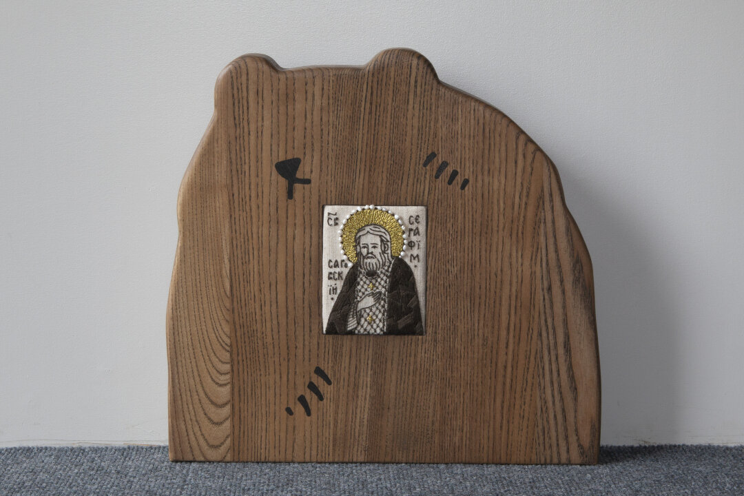 Итогом резиденции стала моя работа для Cosmoscow – там был стенд, посвященный ее участникам. Я придумала раму в виде медведя (по легенде, Серафим Саровский кормил дикого зверя в своей пустыни): нашла в Нижнем Новгороде мастера, который выпилил ее по моему проекту, а глазки и коготочки выточил из мореного дуба – так городецкие краснодеревщики украшали свои произведения. Внутри – вышитая мною иконка святого.