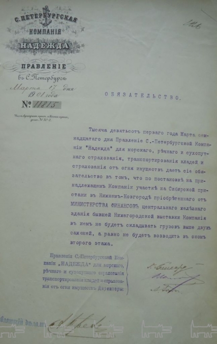 «Пароходная компания «Надежда», как известно, купила центральное здание бывшей в 1896 году Всероссийской выставки. Здание это, построенное из стекла и железа, компания купила специально для того, чтобы перевезти его на свой участок на Сибирской пристани и превратить его в грандиозные несгораемые товарные склады».