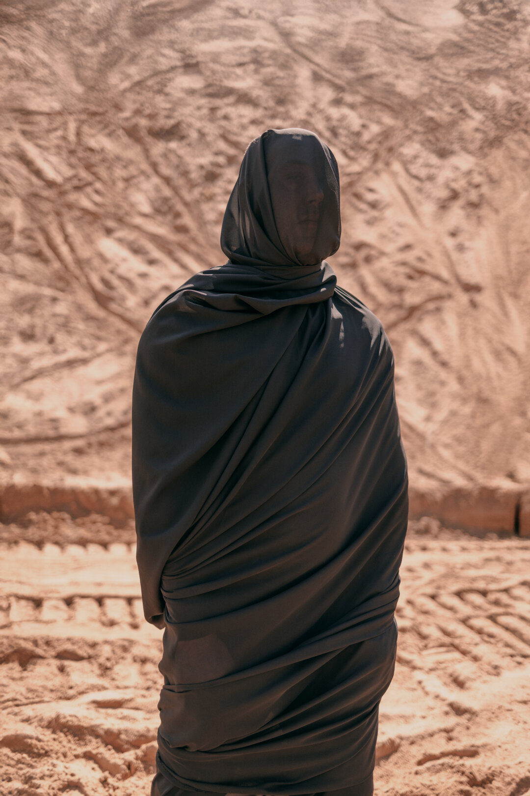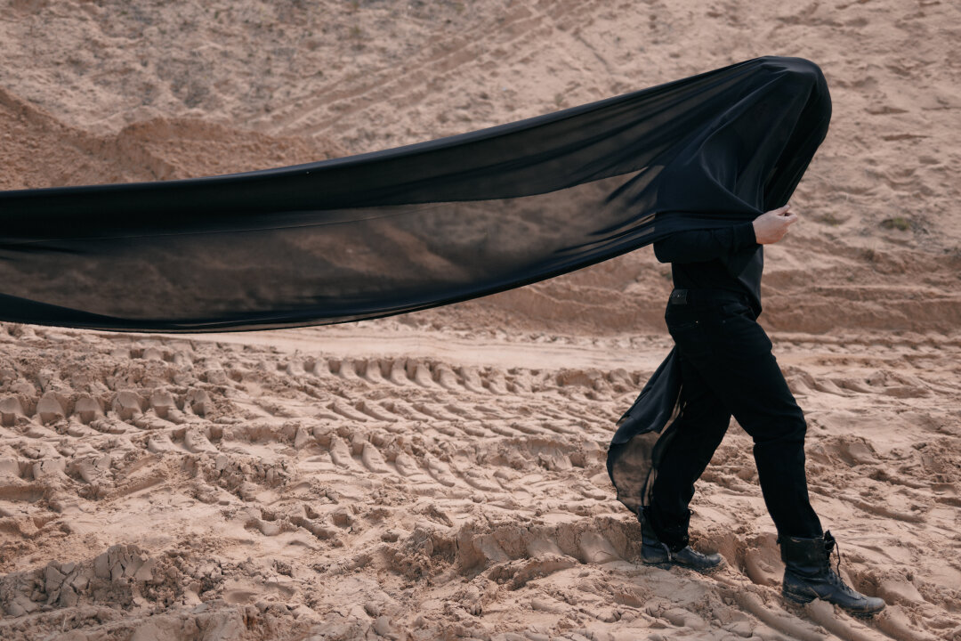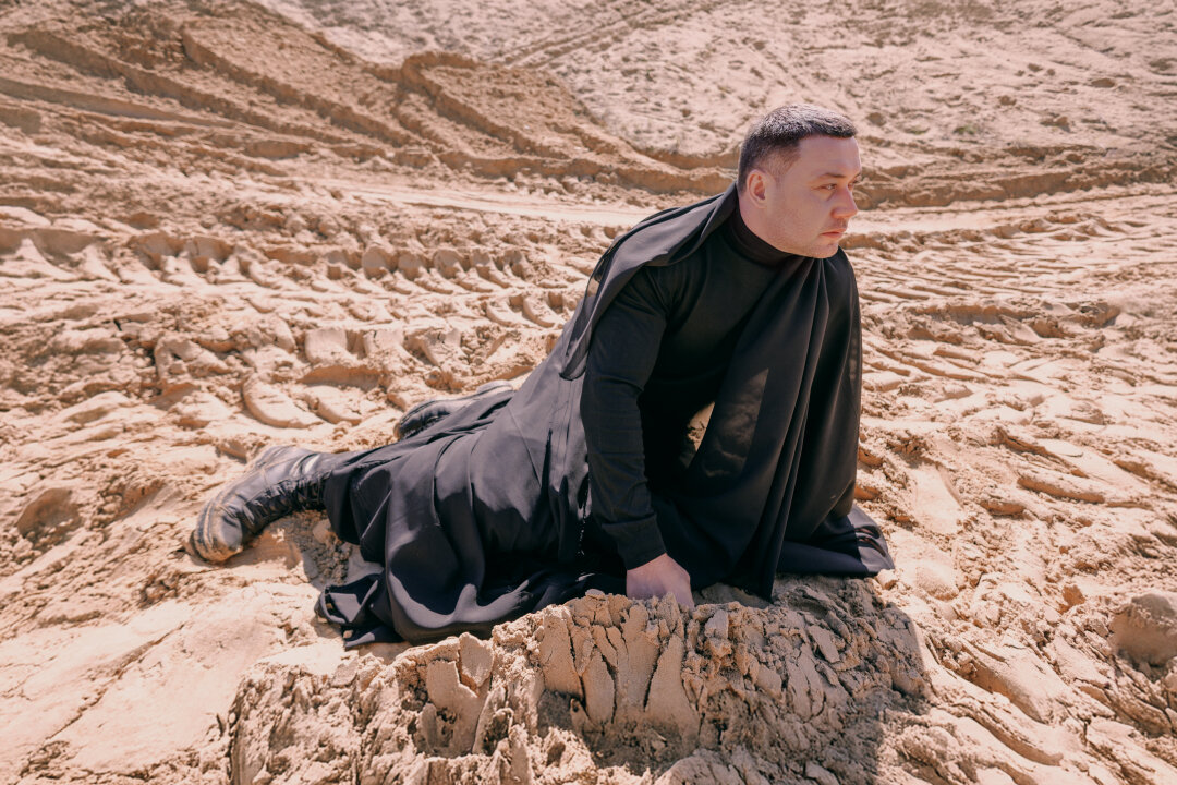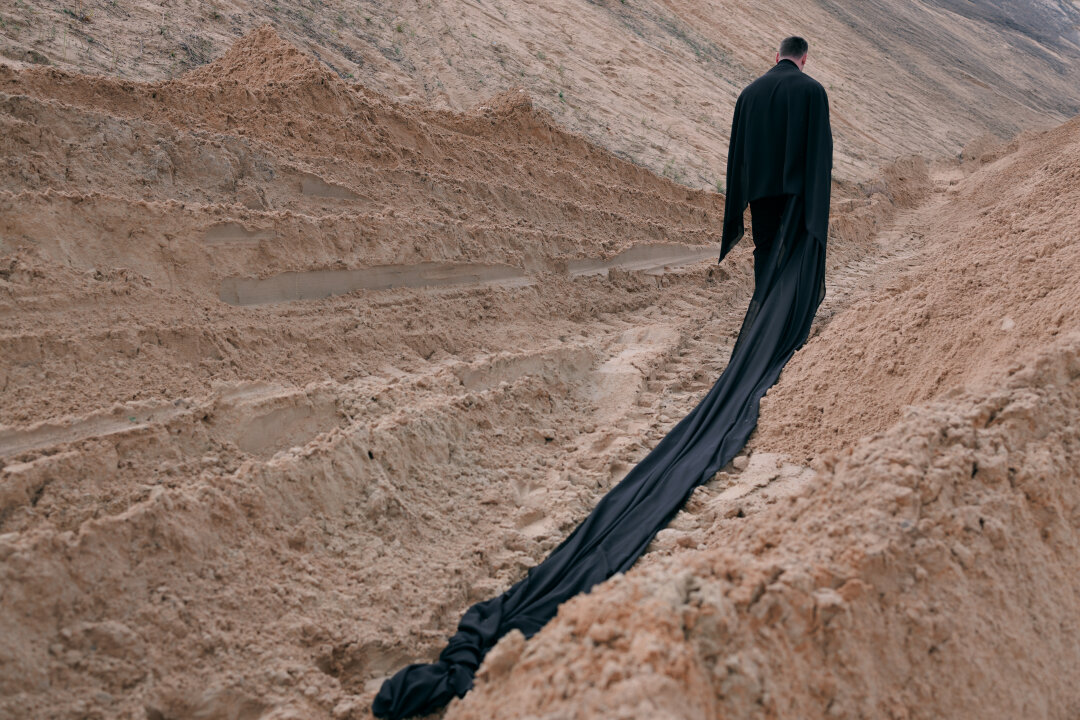 Референсом к фотосессии Александра Купаляна может стать любая из популярных антиутопий: межпланетная «Дюна» или техногенная «Матрица». Незаменимый для этой стилистики тотал блэк в образе художника – выразительный контраст витальной яркости его работ.