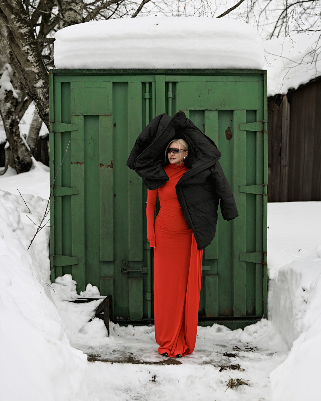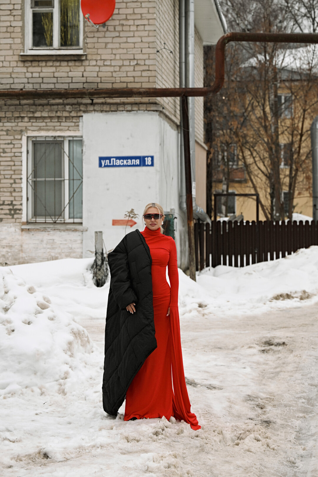Одежда: платье JS SENSE , очки Brenda, пуховик ECRU
