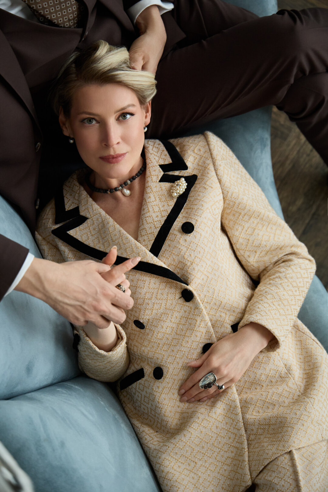 Ольга: По факту я междисциплинарный дизайнер, занимаюсь одеждой, интерьерами, аксессуарами, мебелью, предметами интерьера. В дизайне мне всегда важно отталкиваться не от собственных творческих амбиций, а от потребности человека: его образа жизни, интересов, истории семьи. Эстетика важна, но первична философия и эргономика. В нашем доме я как проектировщик и дизайнер смогла реализовать идеи, которые копила годами. У меня в голове сформировалась своеобразная папка «Избранное», в ней хранились идеи и «фишки» из поездок, из изучения архитектуры, из работы с разными пространствами и предметами. Мы соединили модерн и ар-деко – стили, которые исторически перетекают один в другой. Незадолго до начала строительства мы ездили в Барселону, и там меня поразил Гауди: его почерк, например, можно разглядеть в большой витой лестнице гостиной, но, разумеется, она целиком – плод моей фантазии, «посаженный» на нашу землю, в «соавторстве» с прекрасной бригадой из Чувашии, которая быстро, четко и «за три копейки» выполняла мои требования. Как только они меня не ругали (смеется)! Еще мне очень понравилось то, что придумал архитектор Сесар Манрике на острове Лансароте в Канарском архипелаге – трансформировал вулканические туннели в необычные пространства с яркой мозаикой и растениями. Остров был практически сожжен во время извержения вулкана и стал непригодным для жилья, а Манрике обжил его и превратил в изысканный дизайнерский концепт. Так что с Канар я привезла нашу младшую дочь Настю и новую идею (смеется): остров вдохновил на создание спа-пространства в цокольном этаже. И совсем другая тема – резные деревянные детали в стиле русских наличников, в этом стиле выполнены карнизы на окнах, рамы у телевизора и у большого зеркала в прихожей. Это не выпадение из темы, как может показаться некоторым, а продолжение традиции русского модерна. Дом стоит в России, и русский культурный код здесь важен.