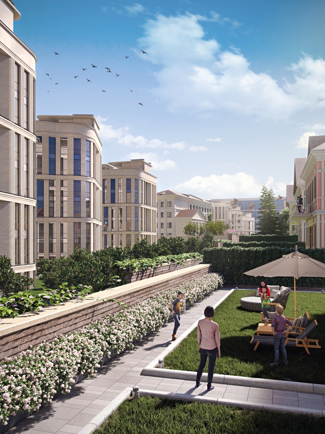 Дома располагаются на общем стилобате, внутри которого находятся парковки, торговые и офисные помещения. Каждый дом имеет выход во внутренний двор-патио на крыше стилобата с площадками для отдыха и прогулок с детьми. Внутренняя территория недоступна для посторонних и свободна от движения автомобилей. Инновационная инженерная система RAUTITAN устойчива к высоким температурам и давлению, к износу и коррозии. Во всех квартирах и пентхаусах уже установлены высококачественные деревянные окна с английским стеклом Pilkington, которое сохраняет прохладу летом и бережет тепло зимой. Начиная с пятого этажа все квартиры имеют панорамные окна с французскими балконами.