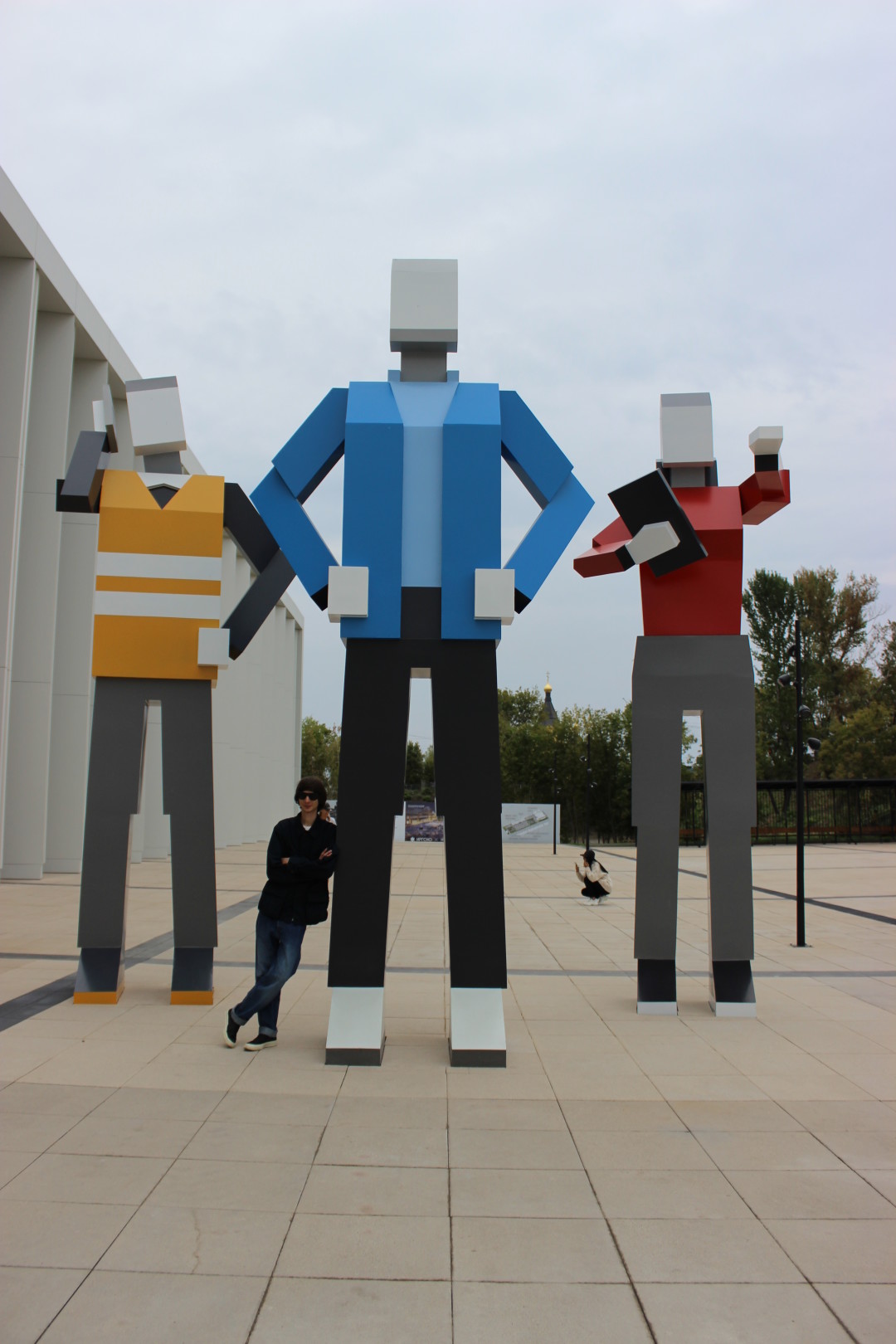 Скульптура называется «Строители будущего» – это три универсальных образа. Первый – вдохновитель проекта, идеолог, организатор. Справа в красном – это девушка, символизирующая архитектора, то есть человека, который проектирует идею. Слева, в желтом жилете – прораб, который занимается реализацией проекта. Работа была создана специально для обновленного пространства Ярмарки к 800-летию Нижнего.