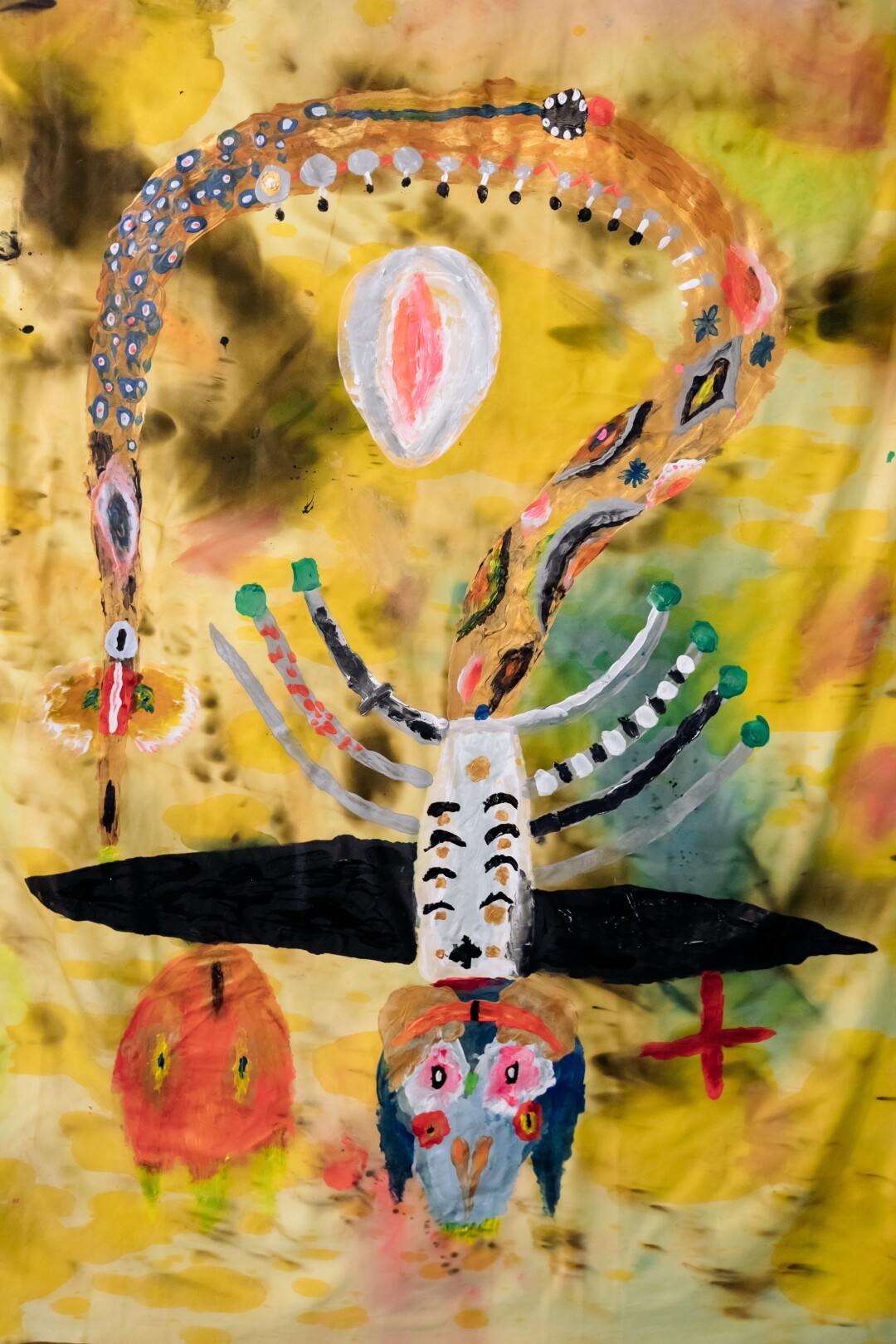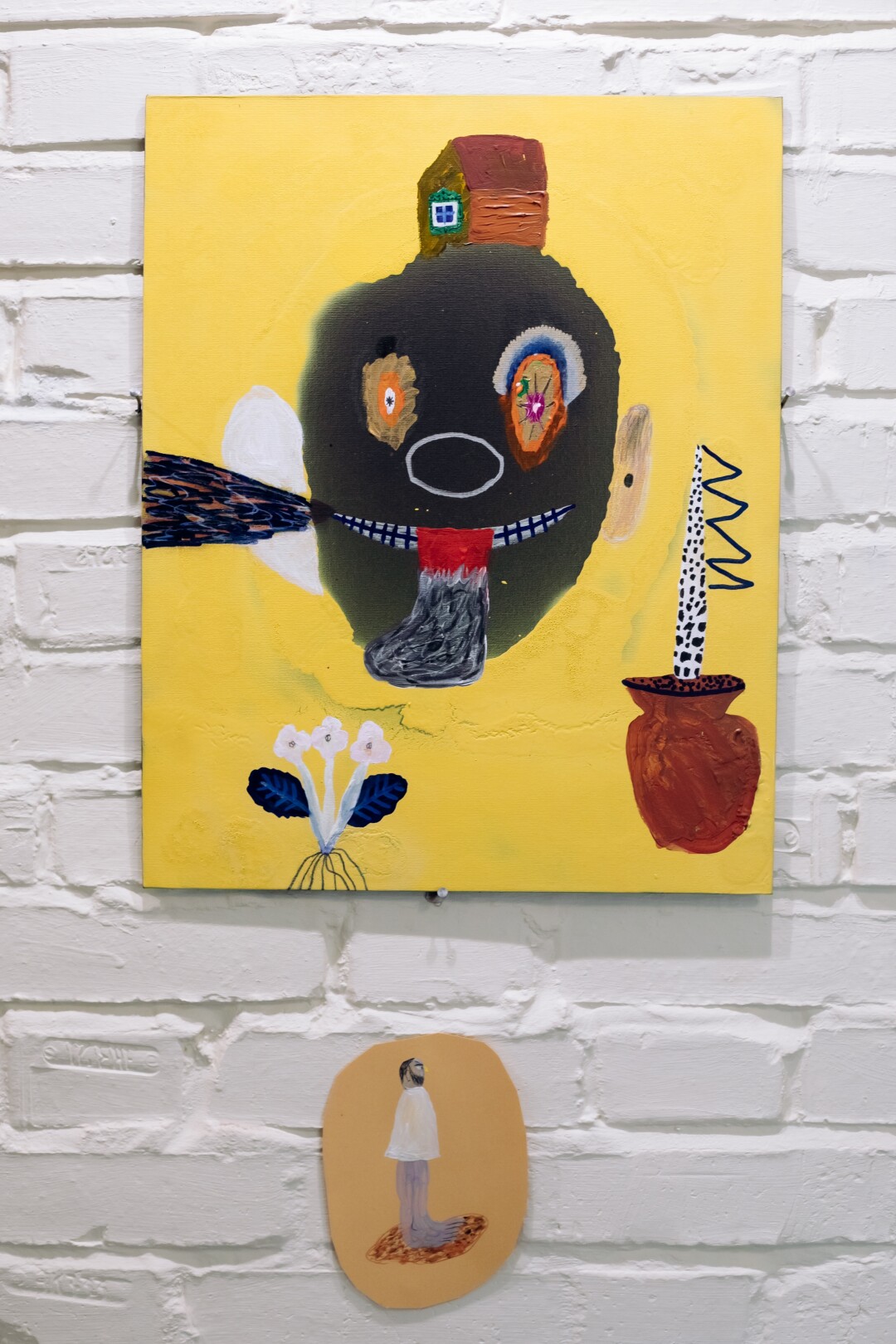 В работах я хотел ставить перед собой новые для себя изобразительные задачи — разработку примитивизма, детскости. Так, три панно на фанере устроены как своего рода игральные доски с графемами, ребусами, связанными с разными приметами. Я рисовал их сразу, без эскиза, в них, как в броске костей, ничего нельзя поправить. Каждый элемент этих панно как эмблема - призывает к узнаванию, но очень популярные приметы перемешаны тут с весьма экзотическими. Иногда они взаимодействуют друг с другом, складываются в маленькие истории, а иногда сосуществуют независимо, как в гербе. Оторванные части тела на этих панно отсылают к раннему детскому восприятию отдельных частей тела на картинах, чье продолжение уходит за рамки полотна, как действительно отделенных от единого тела.