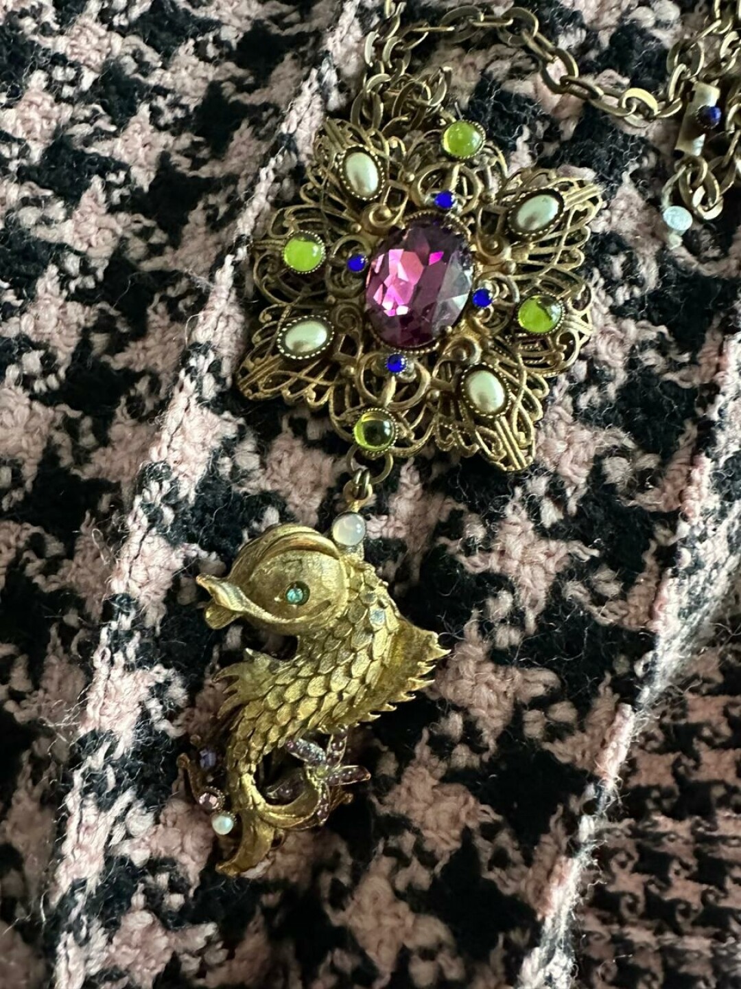 Я открыла для себя художницу Ирину Чипенко. Приобрела одну ее работу. Также мое сердце покорили винтажные украшения из Петербурга. Купила медальон 40-х годов. Еще узнала о молодом дизайнере Анастасии Хохловой — бренд MIRRHAYA. Они представляют уникальные пиджаки, занимаются инкрустацией сумок и костюмов.