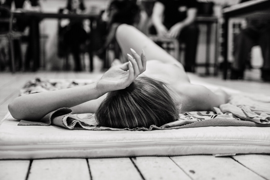 Аня: Позировать физически тяжело. Даже лежа, я ни на секунду не расслабилась, не закрыла глаза и уж тем более не уснула (у некоторых моделей, слышала, и такое бывает). Как оказалось, глупо пытаться делать вид, что никого вокруг нет. Все (все!) знают, что ты смущаешься, но все к этому давно привыкли. И да, ни о какой возбуждающей неге от осознания, что я тут муза, тоже не было. Но временами было очень смешно (это нервное, конечно). От обстановки, комплиментов (все восхищались моим ростом*!), чувства абсолютной незащищенности.