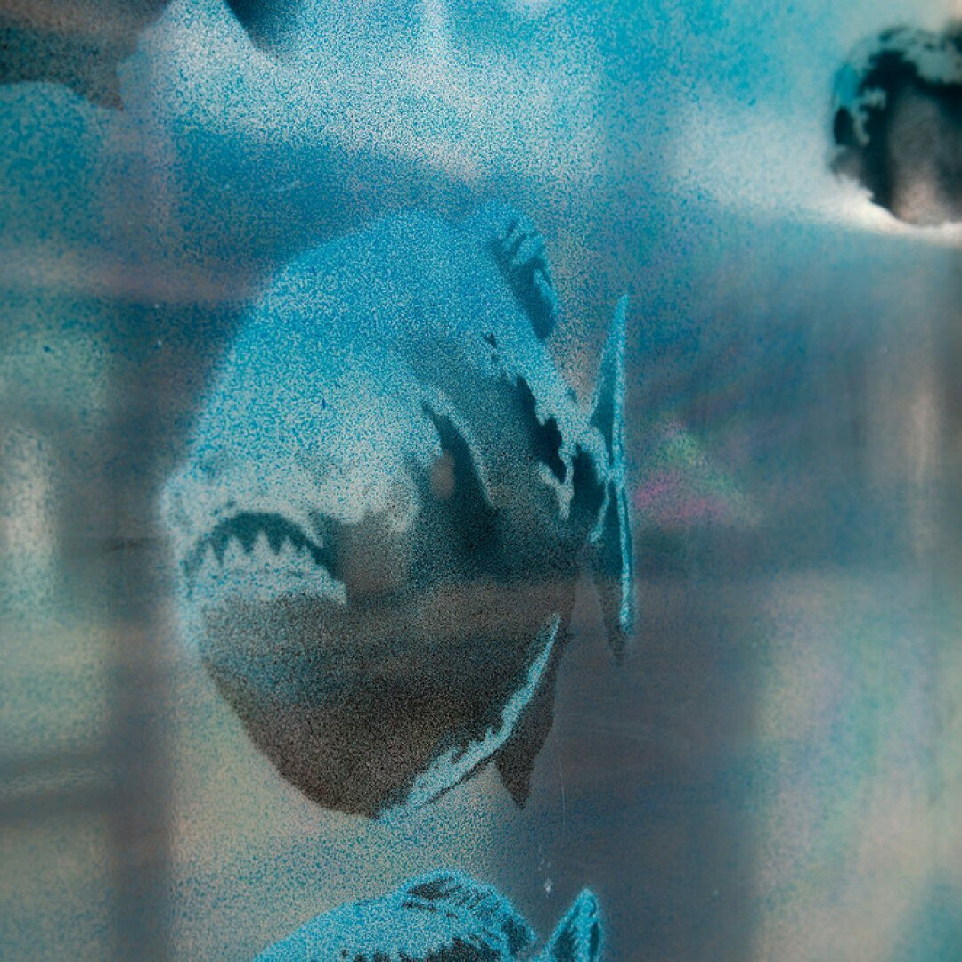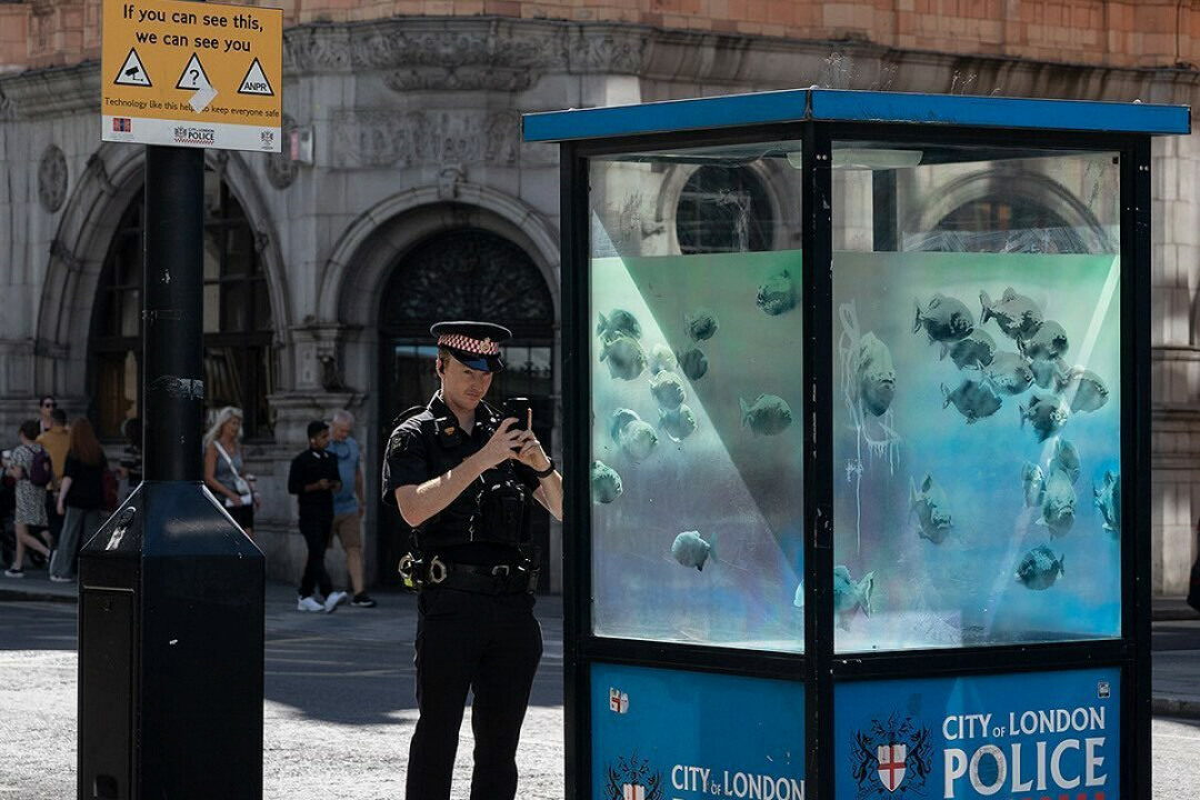 На этот раз художник переделал стеклянную коробку полиции в аквариум с пираньями.