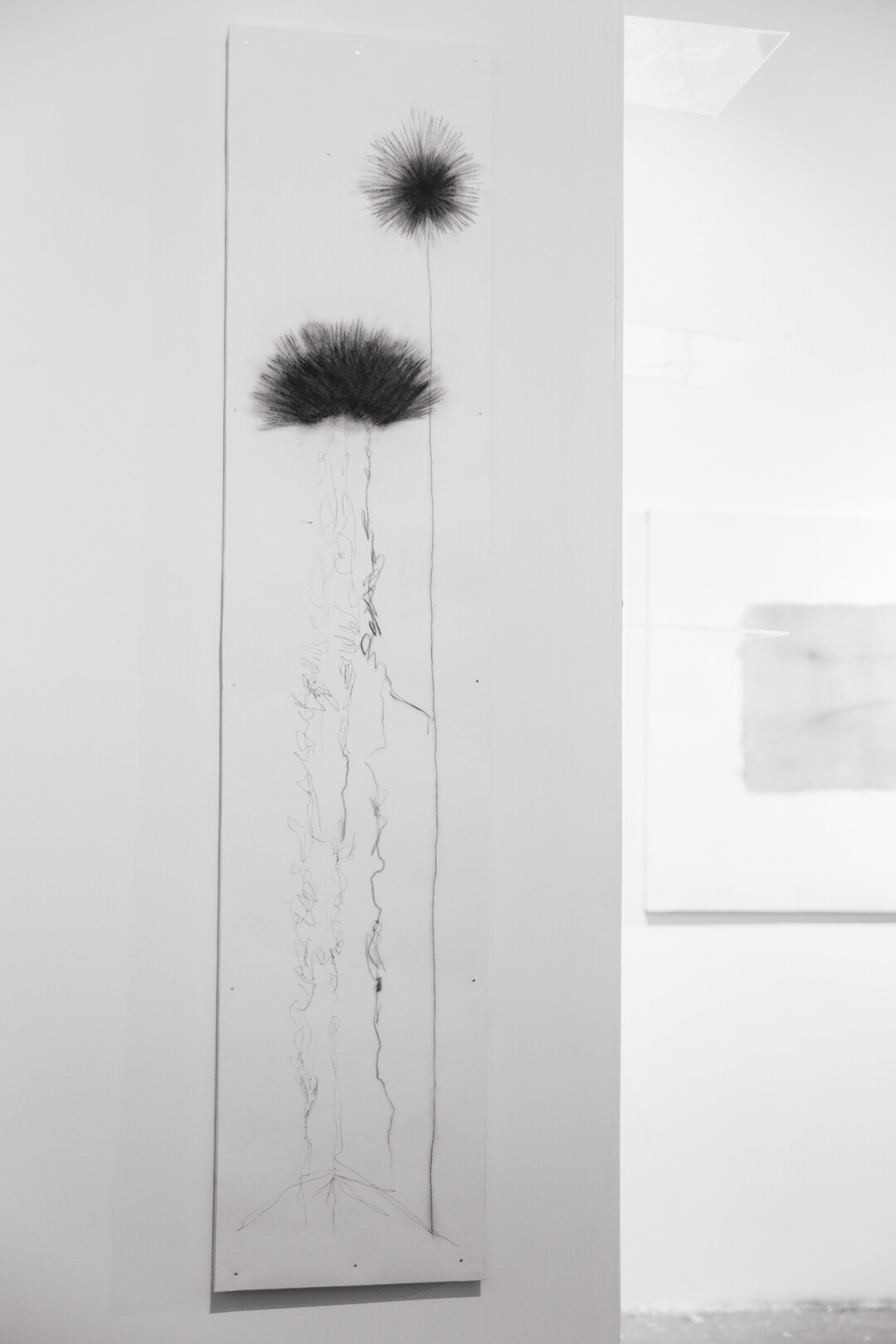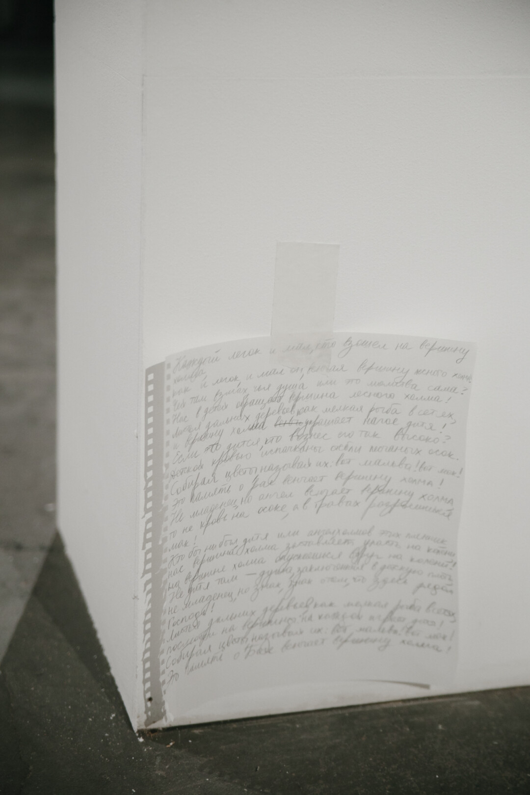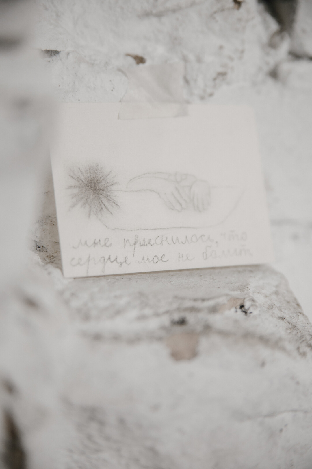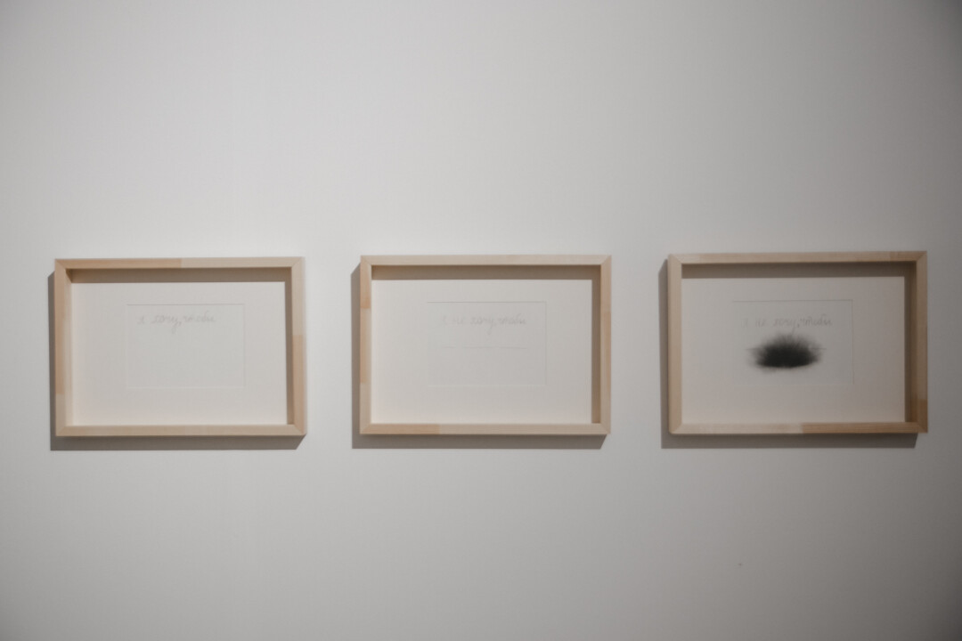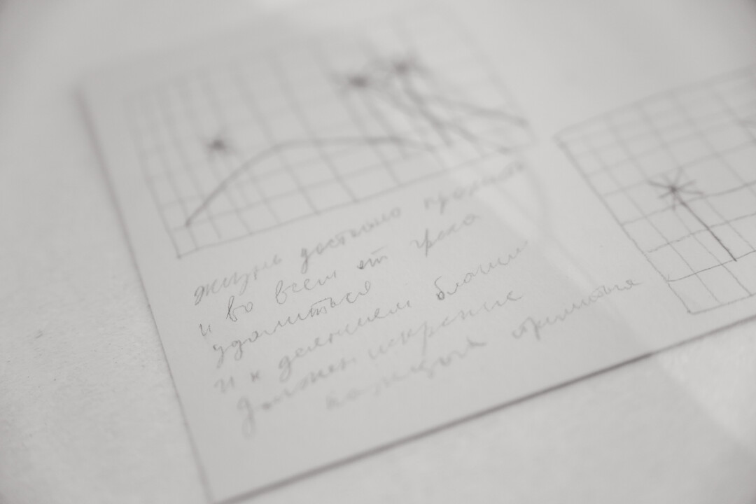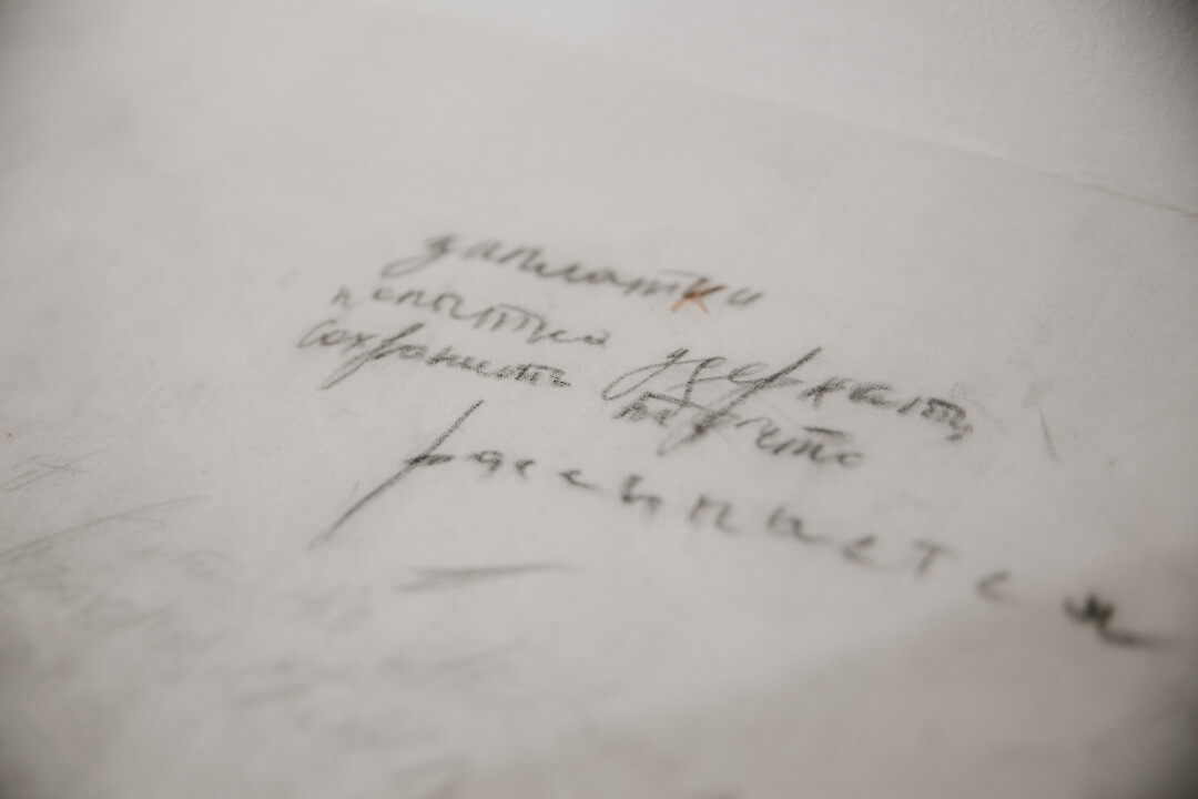 Так как важную роль в творчестве художника играет поэзия, среди работ прячутся тексты. Где-то — масштабные, а где-то — едва уловимые, похожие на случайные знаки. И увидеть, понять все не так-то просто.