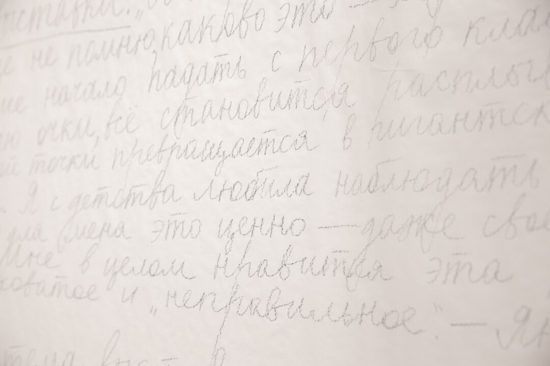 Шестой студийный альбом канадского музыканта Тима Хекера Ravedeath фоном, расклеенные повсюду тексты Владимира Набокова, Николая Гумилева, Леонида Аронзона и других, «пустая», залитая белилами и «спрятанные» работы, диптих из черновика и оригинала, тени в главных ролях — Яна Серобабина представляет свою первую персональную выставку «Каково это — видеть?». Она про процесс распада и состояние «между». Художник взаимодействует со зрителями с помощью разных инструментов и, по нашим собственным ощущениям, мастерски погружает в трансовое состояние.
