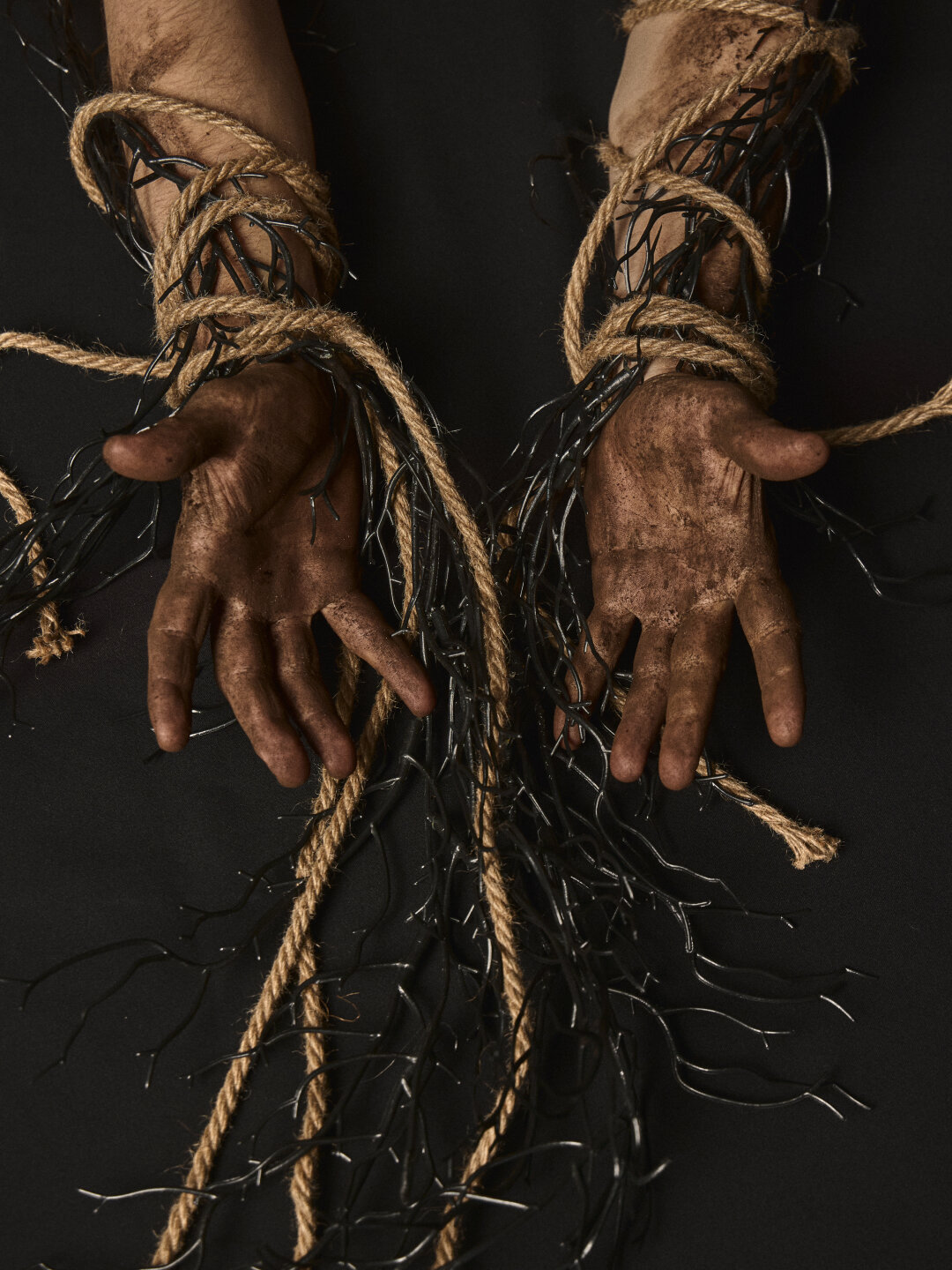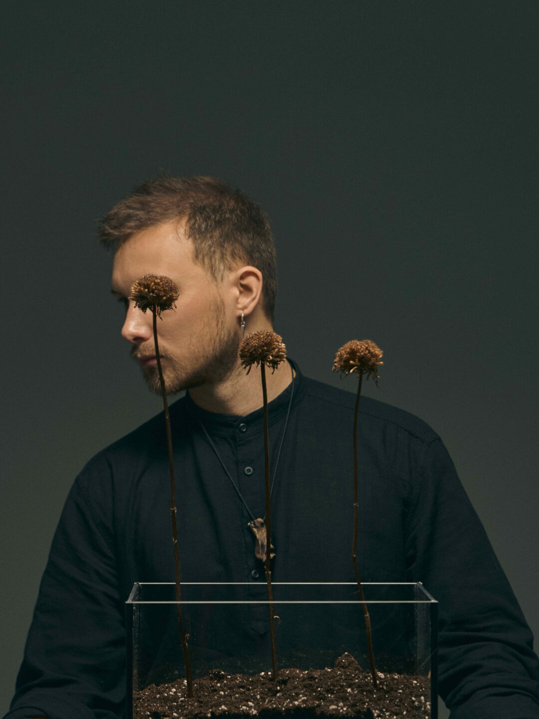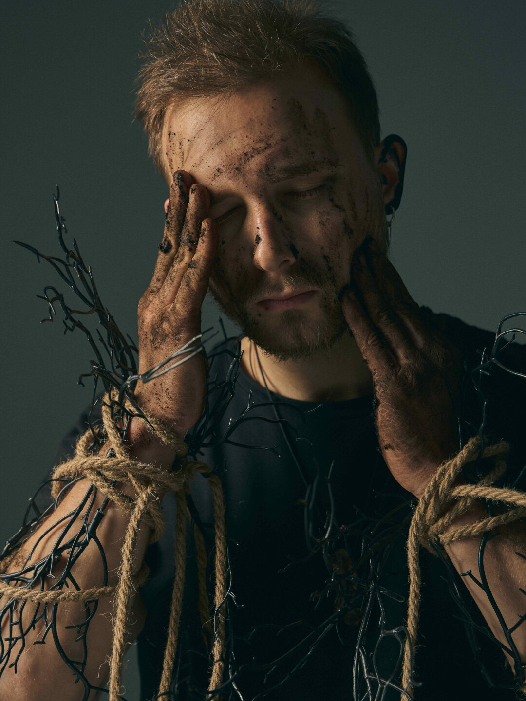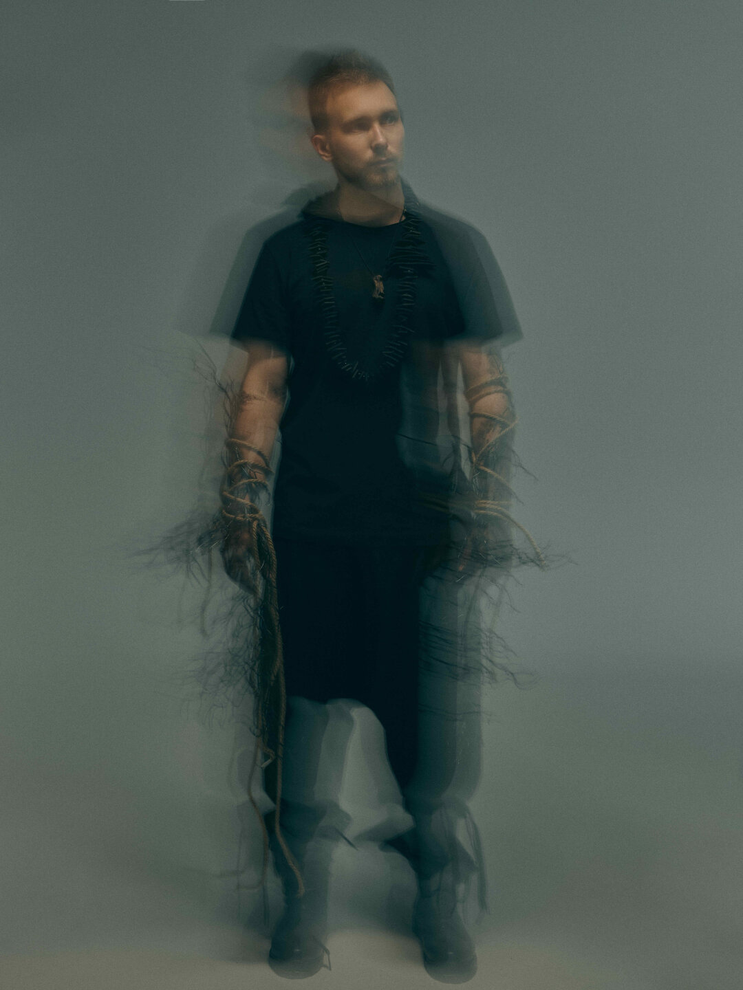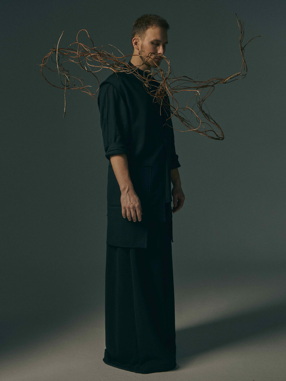 В основе фотосессии героя – синергия искусств (арт + фэшн!). Нижегородский дизайнер Нелли Крук средствами моды передает хтонический мир, который Даня Пирогов воссоздает в своих работах.