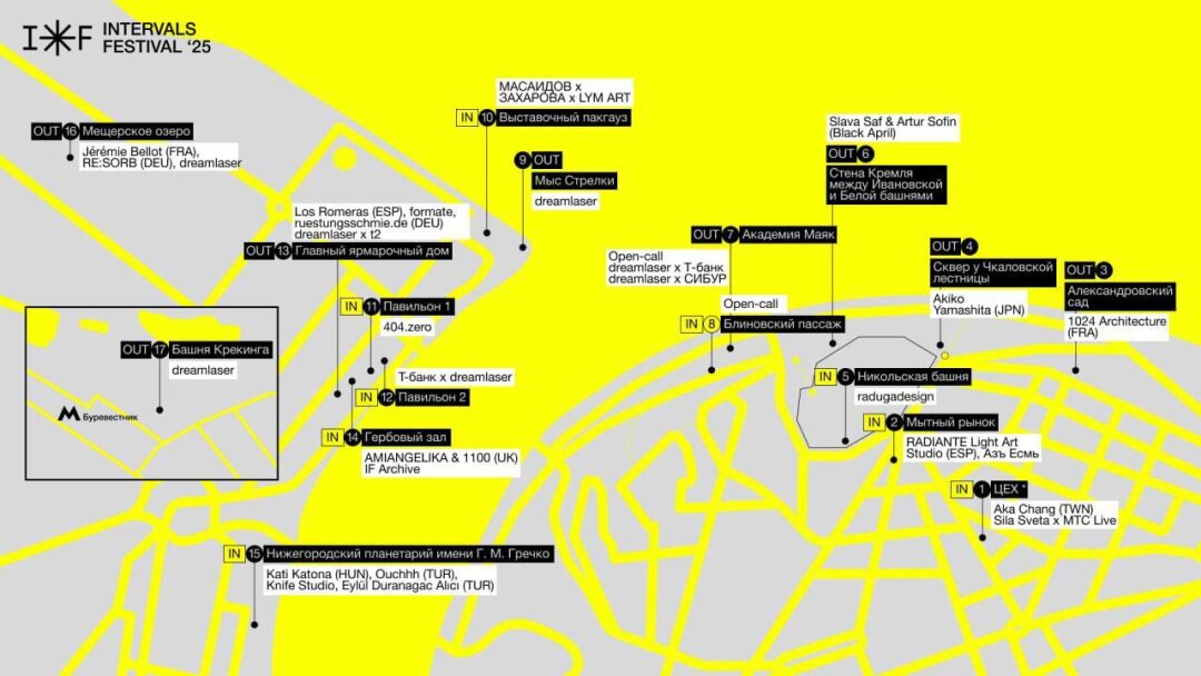 Смотрим карту крупнейшего в стране фестиваля мультимедийного искусства – в этом году 19 локаций (6 новых!), не только в верхней (ЦЕХ*, «Маяк», Кремль), но и нижней части города.