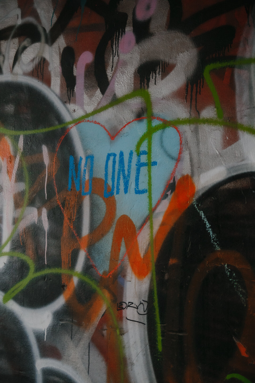 «В этой арке спят бомжи, курят повара и полицейские, переводят дух цыгане-уборщики Покровки. Когда-то тусовлись скейтеры и граффитчики, пока их окончательно не выдавили с Драмы. От скейтеров в этой арке такая зарисованность. No one. Надпись, сделанная в случайном контуре сердца. Она не принадлежит никому».