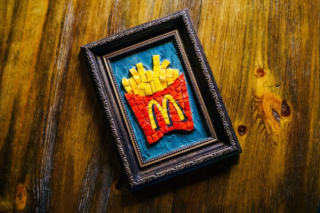 В своих работах художник миксует народное творчество, советский стиль, совриск и минимализм. А еще создает реплики известных мозаик, например, из московского метро и древнеримского изображения собаки.