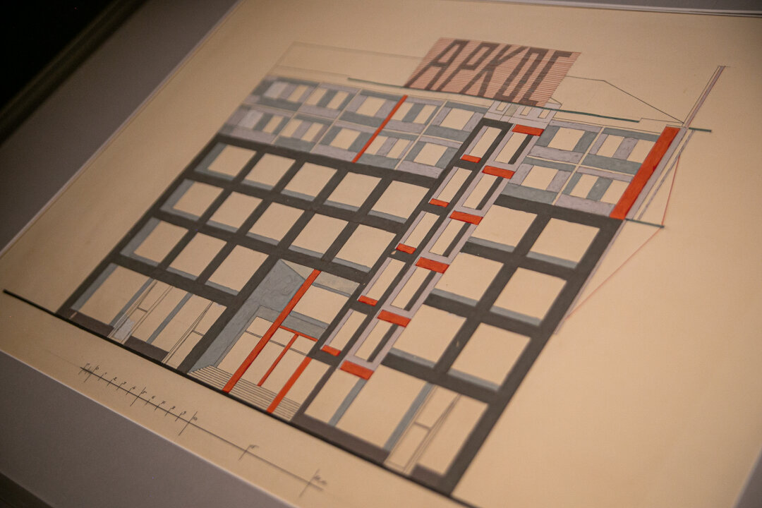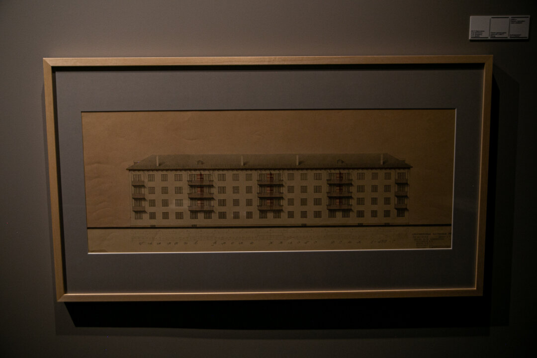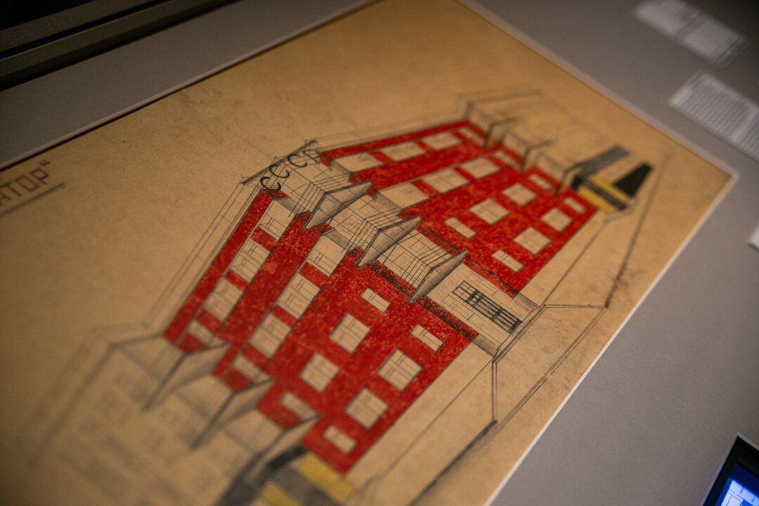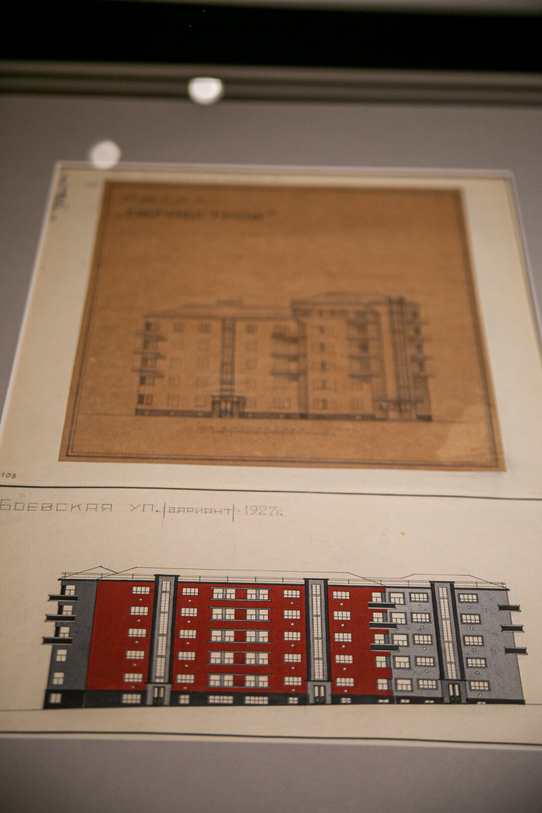 В зале музея ВМЗ устроили архитектурную лабораторию, в которой чертежи и эскизы первых панельных домов соседствуют с работами авангардных художников и их видением идеального жилища.