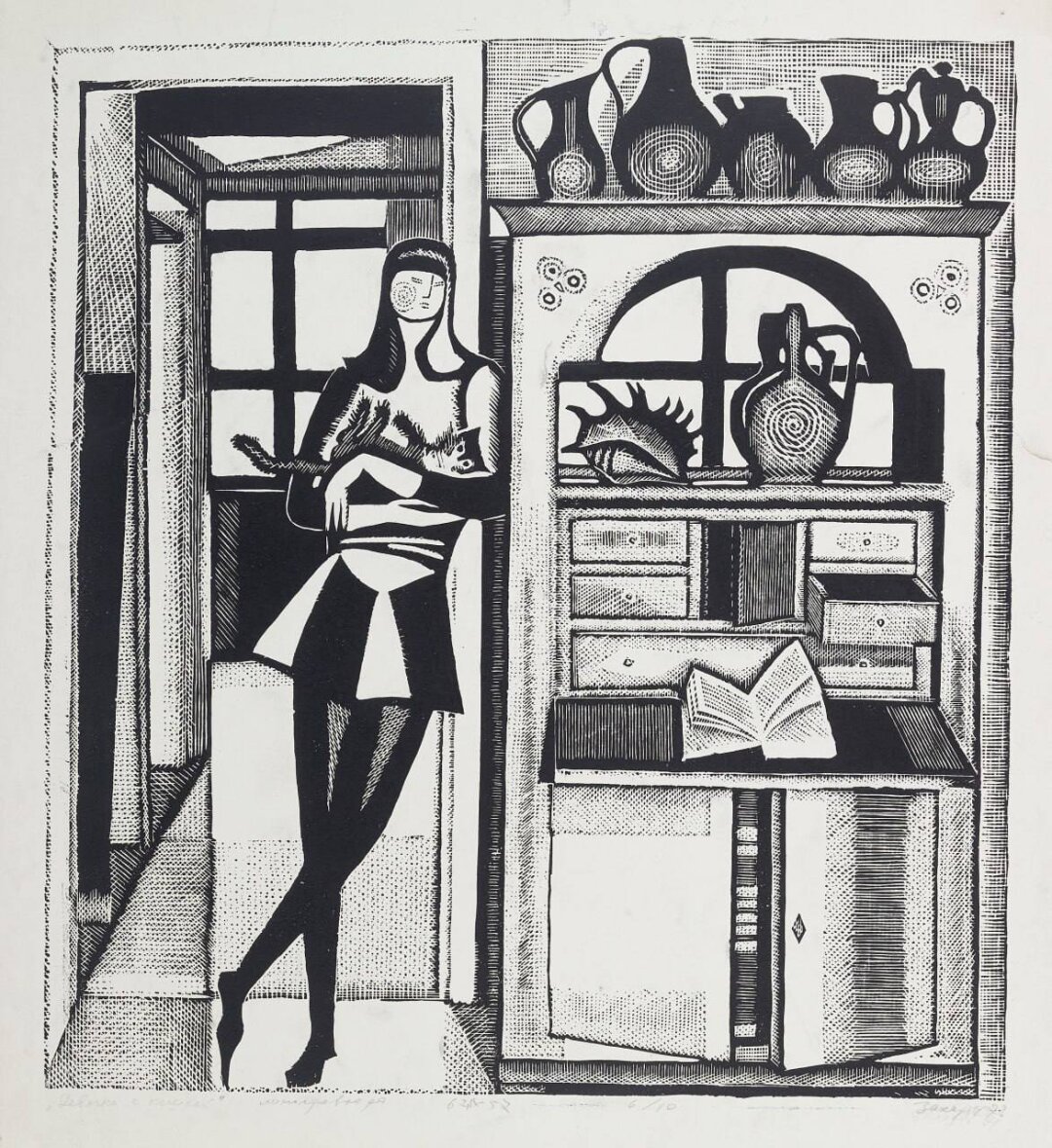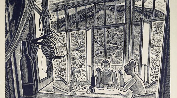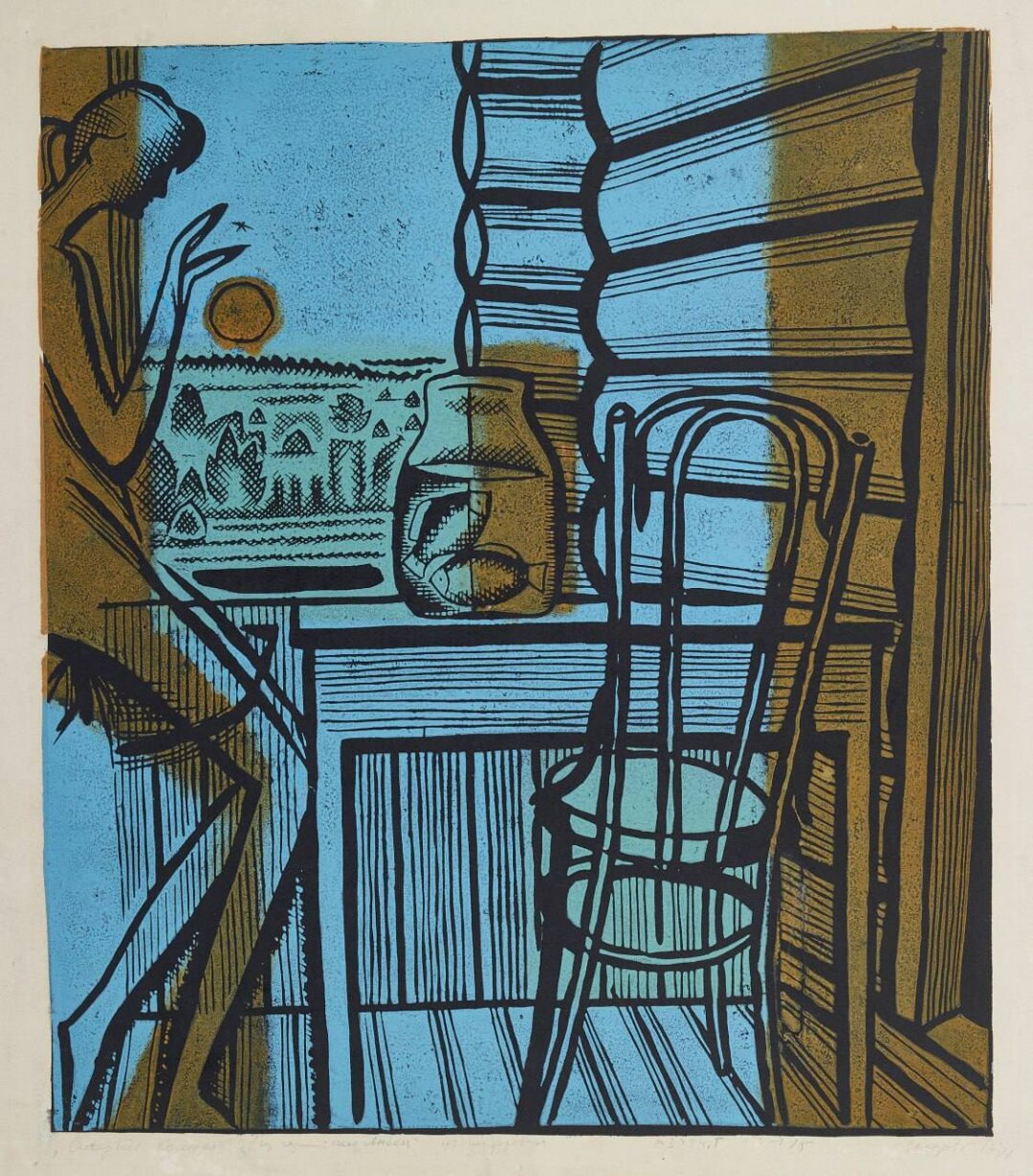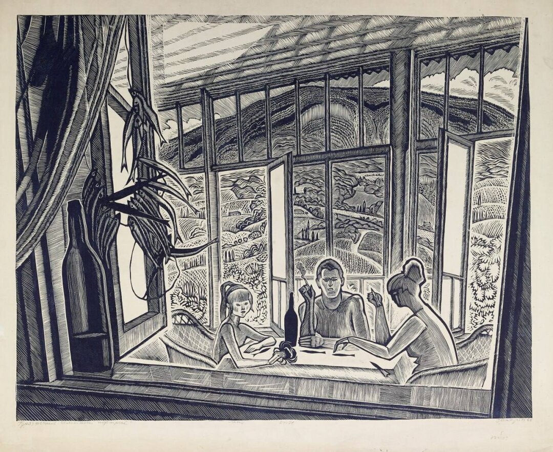 Для Захарова была очень важна тема семьи и материнства. Например, в линогравюре «Гурзуфский семейный портрет» он изобразил себя, свою жену – скульптора Татьяну Соколову (супруги называли друг друга Кентавр и Амазонка!) и дочь Наташу. В гравюре «Московский ужин» к ним присоединяется теща Екатерина Васильевна и кошка Оля, тоже член семьи, в которой всегда были животные. График работал тонкими штрихами, передавая сенсорные особенности обстановки: невесомость прозрачной занавески, гладкость оконной рамы, пышность крымской природы.