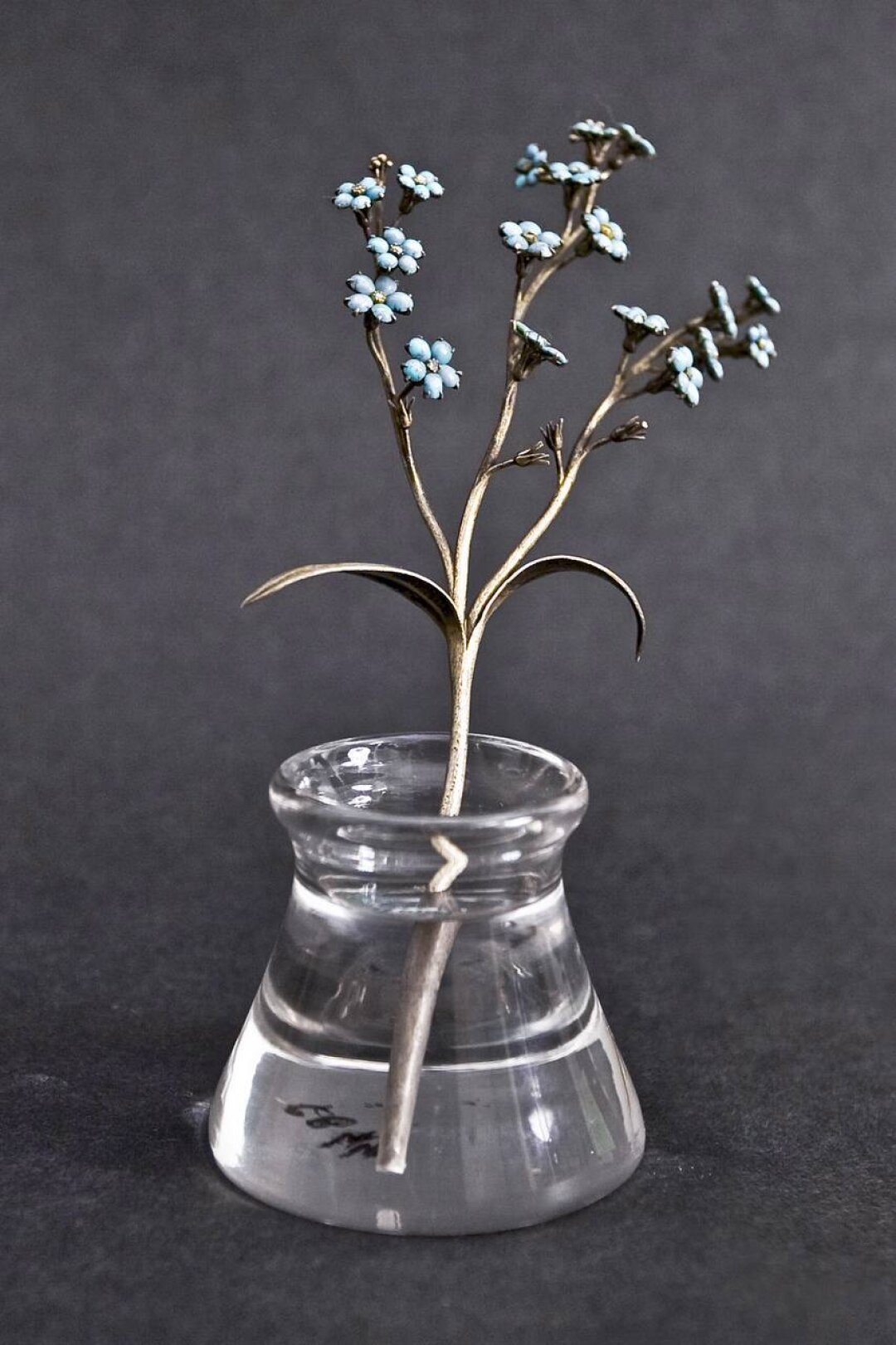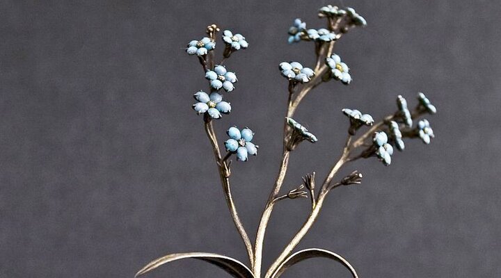 Один из ключевых экспонатов – флоральный этюд «Веточка незабудок в вазочке» (1900-е годы), поступивший в НГХМ в 1919 году из собрания российского промышленника Семена Абамелек-Лазарева. Это 12-сантиметровая ваза, где вместо воды плещется горный хрусталь, в котором преломляется серебряный стебель с лепестками из бирюзы с маленькими алмазами в центре соцветий. Кстати, сам Фаберже и его мастера перед тем, как взяться за работу, тщательно изучали растения в специально построенных для этого теплицах.