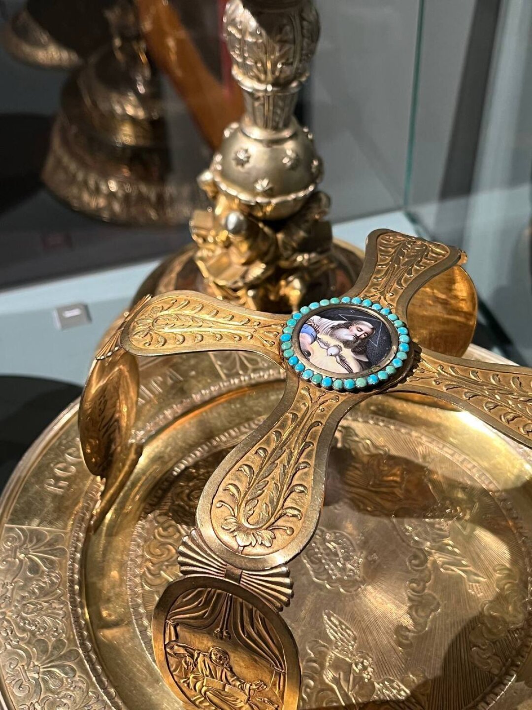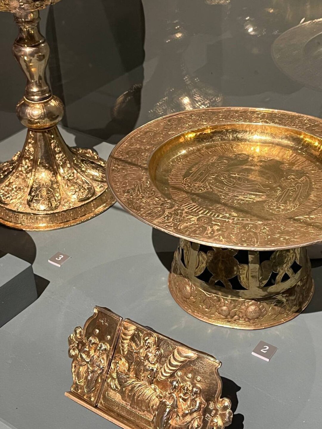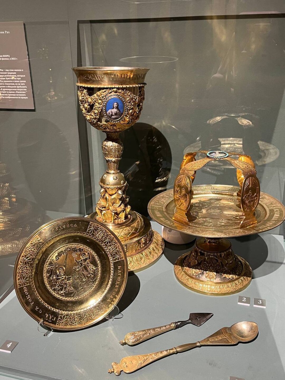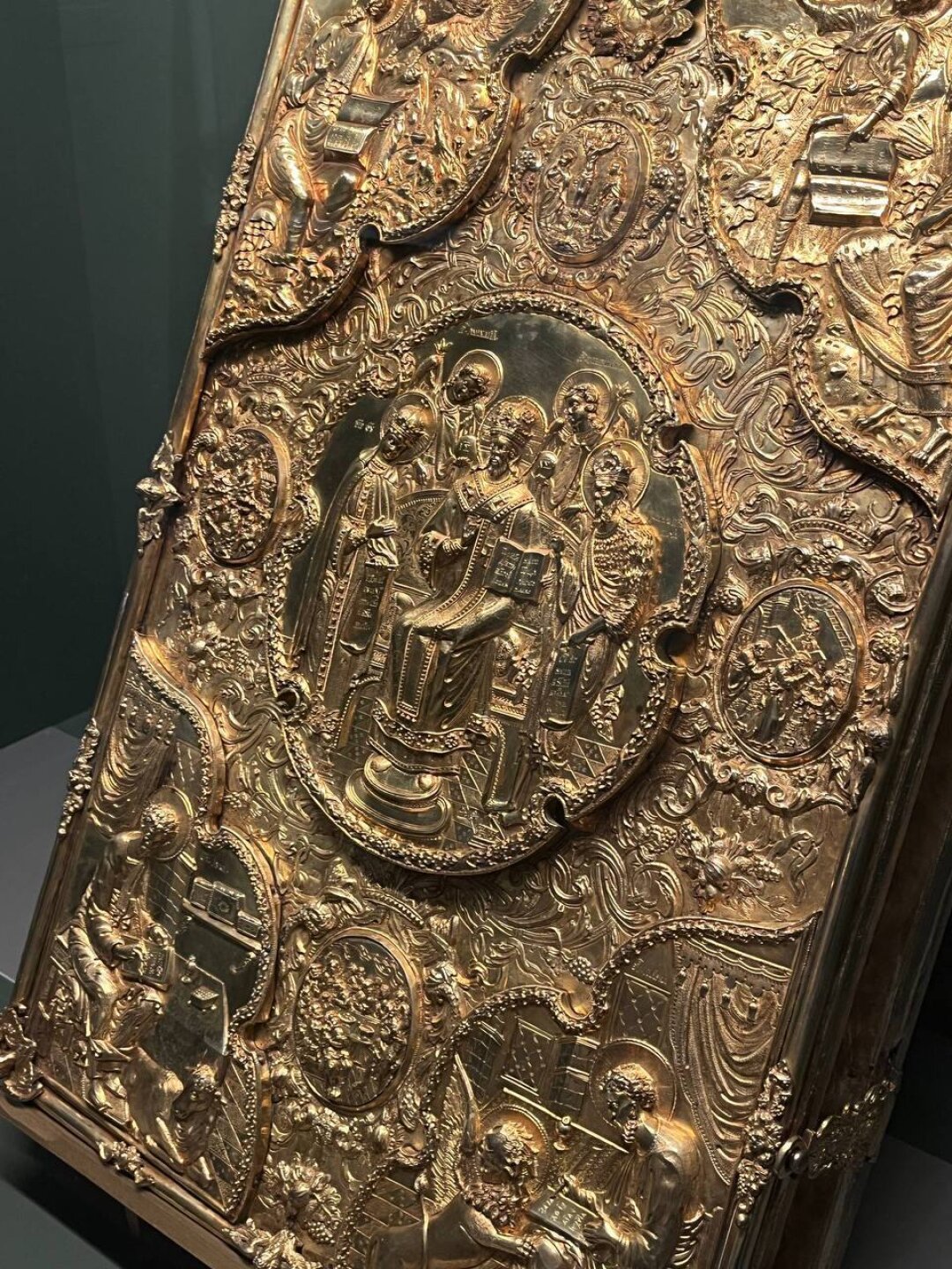 Центральное место в экспозиции серебра 17-19 веков занимает большое напрестольное Евангелие (16 кг!) в позолоченном серебряном окладе (1706 год) – относится к ювелирному искусству русского барокко.