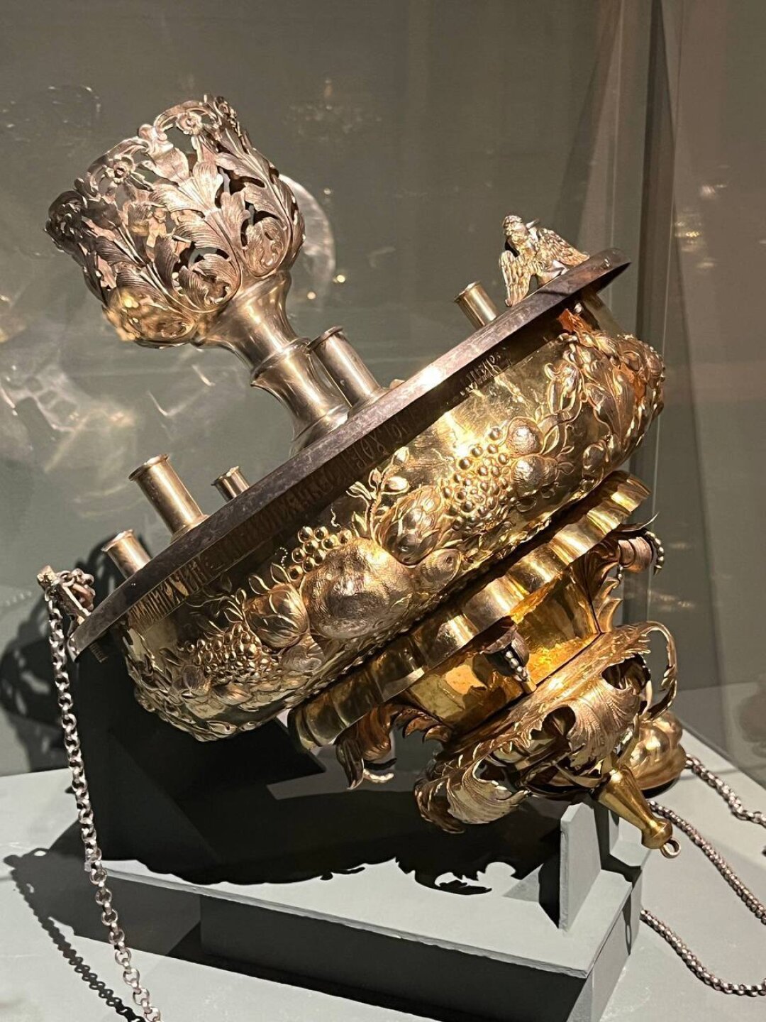 Произведения, созданные нижегородскими ювелирами, отличаются массивностью форм и богатством рельефного декора. В зале можно увидеть водосвятную чашу 1700 года и ковш-корчик с носиком, увенчанным литой головкой в античном шлеме. В это же время создан и большой храмовый подвесной светильник – кандило с убранством в виде тяжелых фруктовых гирлянд и акантовых листьев.