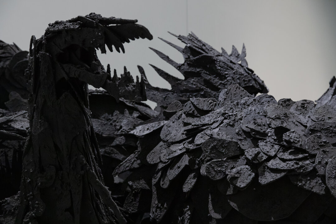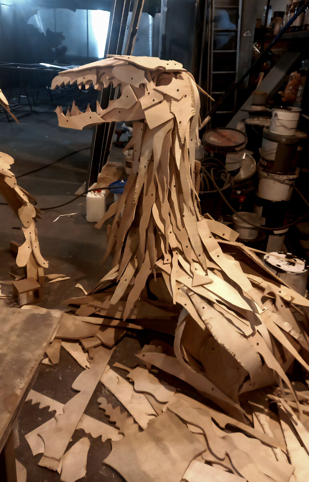 Первый раздел посвящен античности и академическому искусству, второй – Средневековью. Именно в нем среди готических скульптур и древних русских икон располагается «Подкоп» Дани Пирогова. Идея создания сказочного существа (каждая чешуйка выпилена вручную!) появилась еще полтора года назад, однако к выстраиванию композиции художник приступил только в апреле – в большом ангаре, множество эскизов и макетов спустя и с командой помощников.