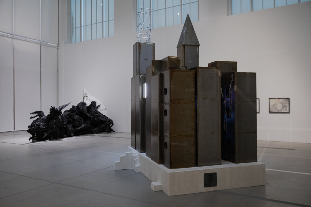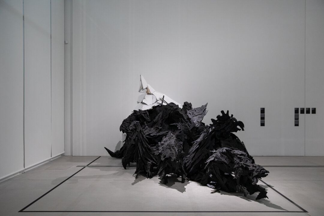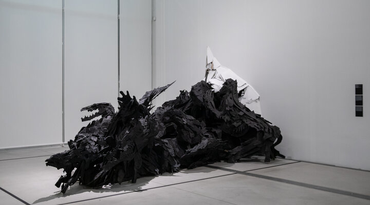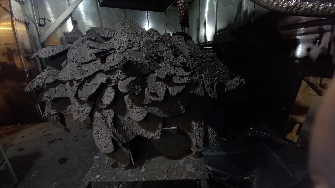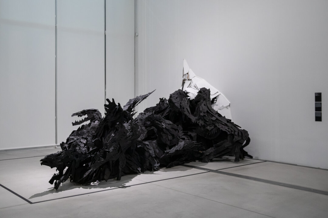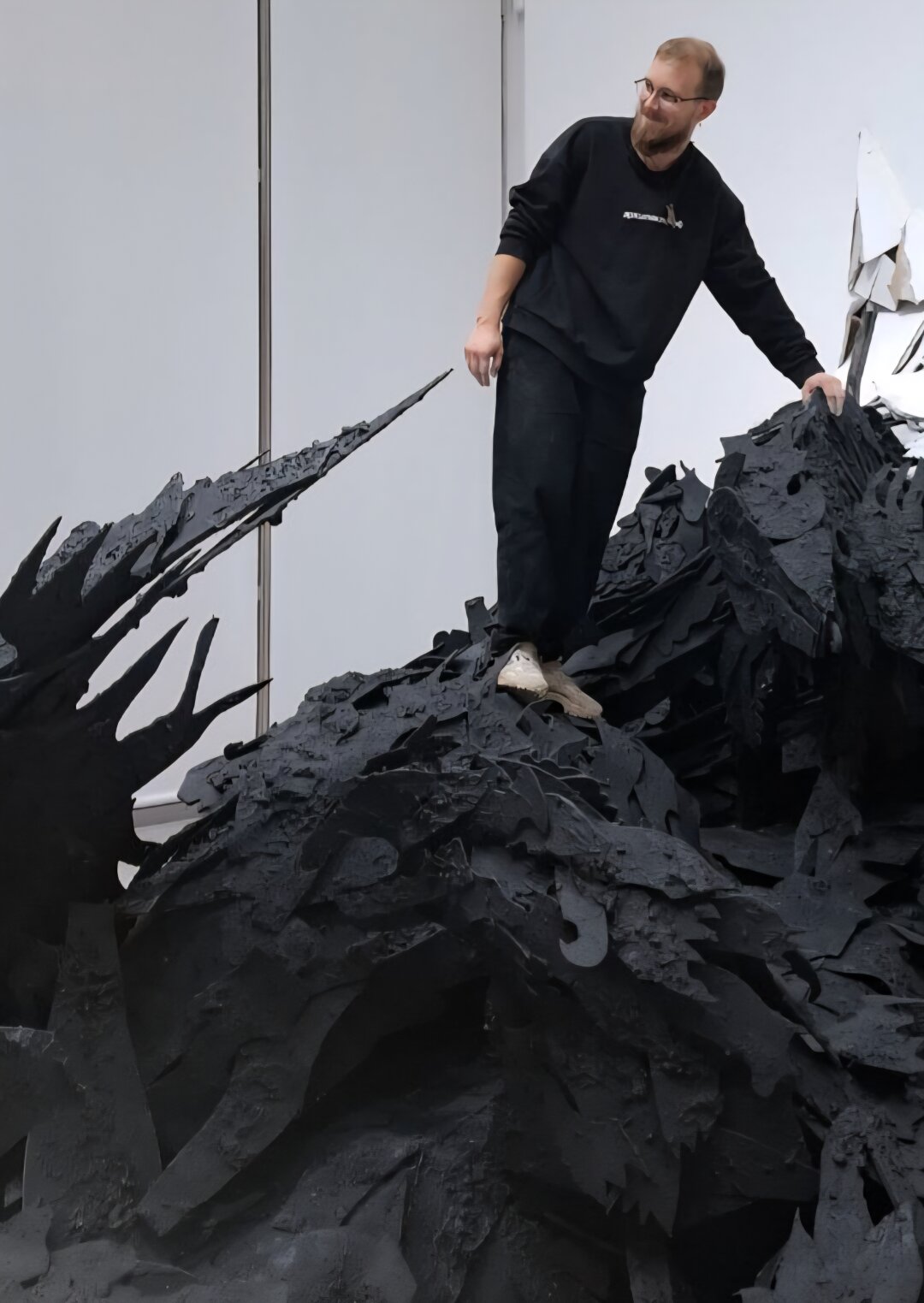 Подкоп я рассматриваю здесь как уязвимое, секретное место, но не под стеной физического укрепления, а в стенах нашего сознания и психики, огораживающих нас от всего того, что в нашу парадигму не вписывается и от своей неизвестности представляется опасным. В этой работе очень важна точка восприятия в пространстве экспозиции: издалека это достаточно абстрактная, хаотическая единая масса, вырывающая из стены и вступающая в диалог с «Башней из слоновой кости» Алексея Громова, а при ближнем рассмотрении можно обнаружить явную фигуративность и черты самих криптидов (животные или растения, существование которых не подтверждено официальной наукой, – Прим. ред.).