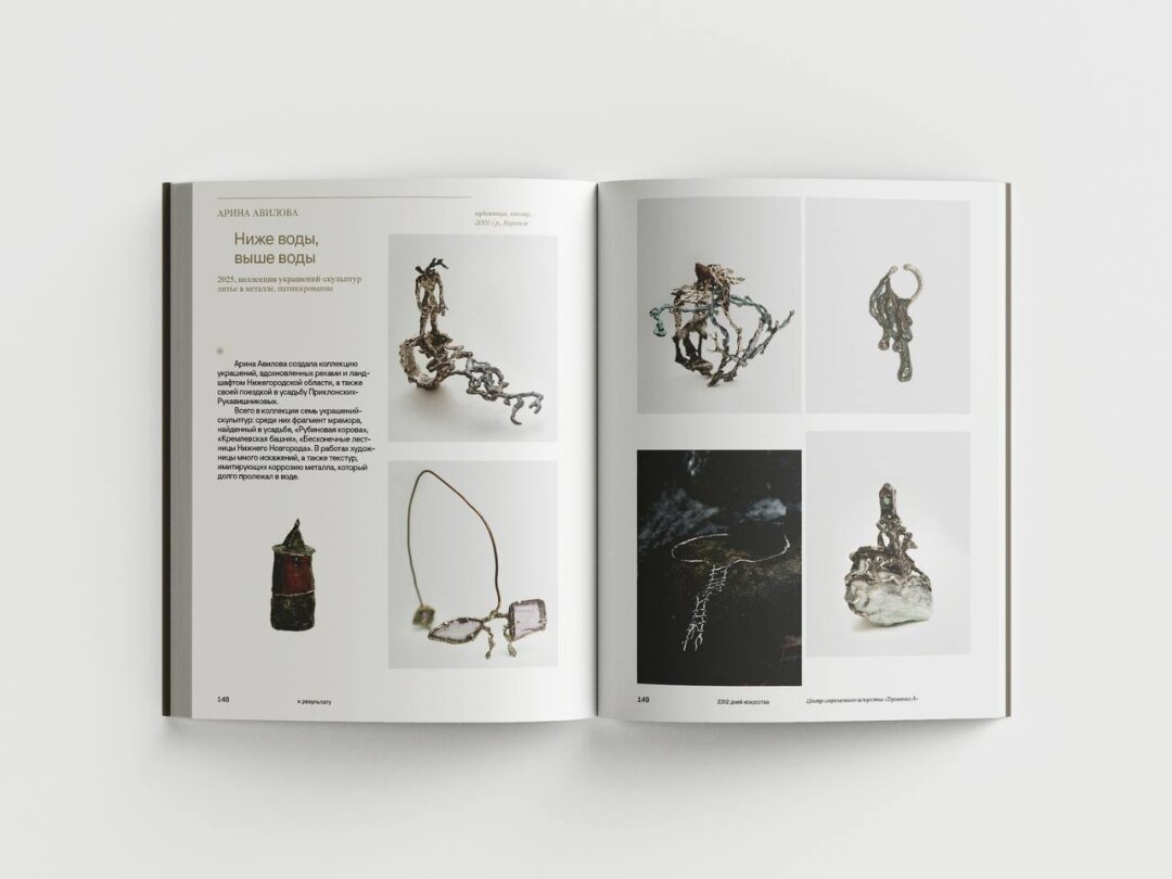 За 3 года в Нижегородской области (лидере по числу арт-резиденций в стране) успели поработать 75 авторов – в сборнике представлены большинство из них. На 168 страницах нашли, например, «ландшафтные» ювелирные украшения Арины Авиловой («Терминал А»), посвященные Нижнему и усадьбе Рукавишниковых в Подвязье; AV-инсталляцию «ROTOR» от команды междисциплинарных художников (ее можно было увидеть этой весной на INTERVALS) и серию «Охотницы» художника, архитектора (и лауреата нашего «ТОП50») Дани Пирогова, созданную для FUTURO.