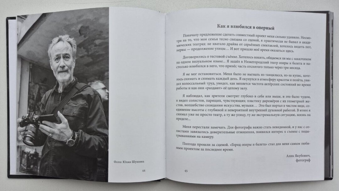 А еще есть фото из разряда «неизданное» – Алик периодически постит их у себя в соцсетях. Серию в фотоальбоме предваряет статья об истории театра (от концерта Шаляпина в Народном доме до создания оркестра La Voce Strumentale). Раздобыть книгу можно только в кассе, что имеет свои неожиданные бонусы – новоиспеченные владельцы тома и сейчас частенько ловят автора, крадущегося с фотоаппаратом между занавесом и коридором, требуя поставить автограф.