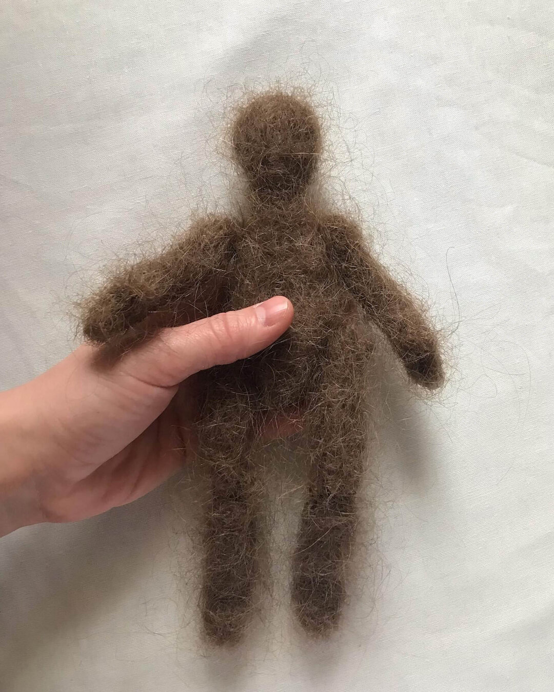 «Автопортрет» 2022 года – это куколка, состоящая на 100% из моих волос. Именно через это происходит идентификация портрета, по форме же объект не имеет отличительных черт. Волосы – любимый мной материал, и эта работа – апогей их использования. Для меня они – точная визуализация времени для конкретного организма. Еще они связывают человека со всеми млекопитающими. При этом в них есть идеальный баланс красоты (шерсть, волосы делают животных, людей привлекательнее) и отвращения (волосы сами по себе, отделенные от тела).