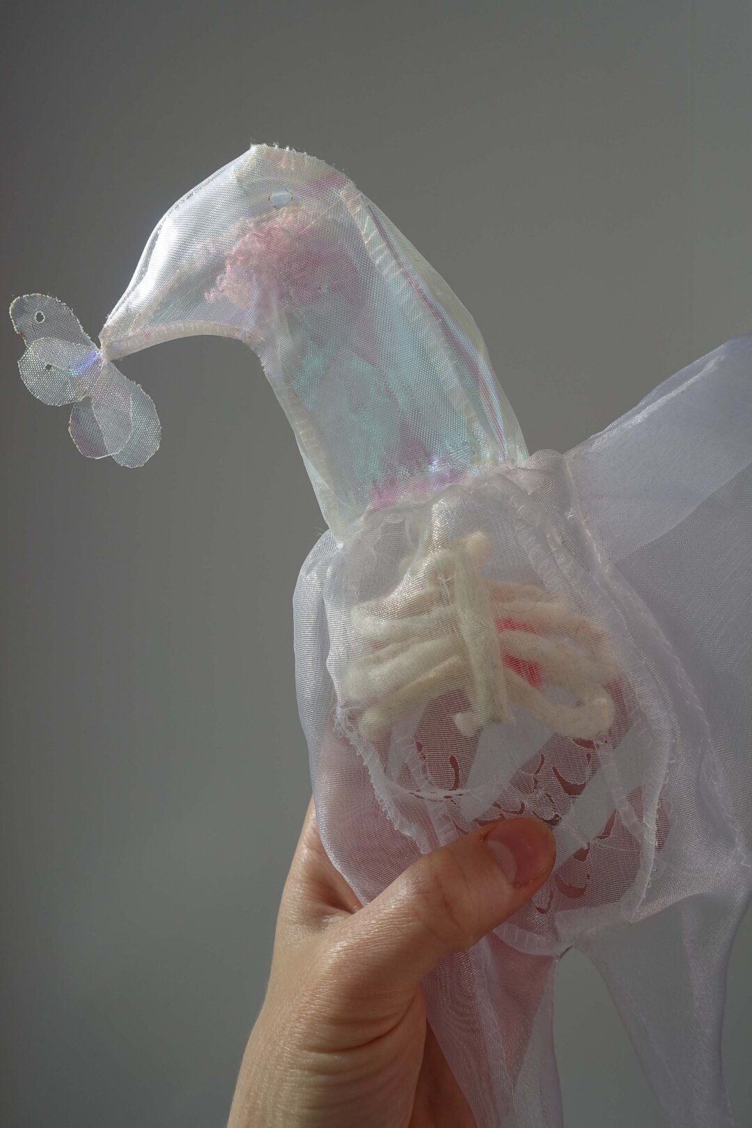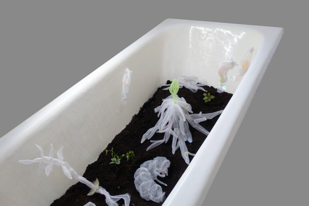 В работах радиорыб применяет разные материалы и техники. Например, есть прозрачные слизни (!) из органзы, ласточки с шерстяными ребрами, букашки, рвущиеся к жизни несмотря ни на что, с кожицей в виде нитей, которые художница взяла от старых носков (серия «Кожица»). А ростки, изо всех сил впивающиеся в почву, чтобы получить из нее как можно больше питательных элементов, сделаны с помощью цианотипии (фотопроцесса, который выдает синее изображение).