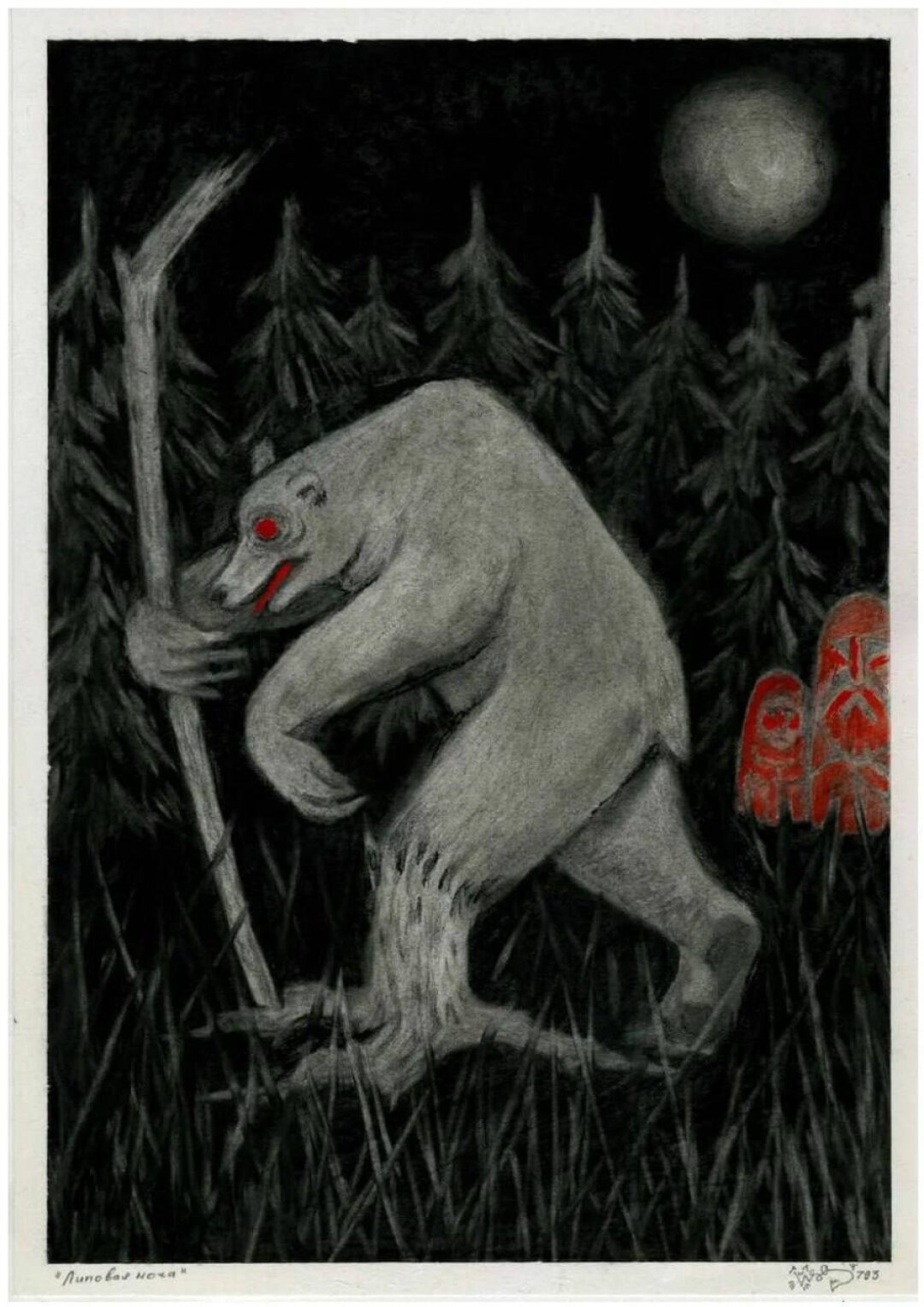 Работы, представленные в комиссионке, – это графика, сделанная соусом. Очень люблю эту технику: ужасно грязная, но и проникновенная. Особенностью такой графики является то, что ты достаешь свет из тьмы. В комиссионке представлены две работы из триптиха «Пан. Сиринга стала музыкой» и работы из серии «Страшные сказки». «Страшные сказки» – это серия о сказочных сюжетах, выходящих за рамки «волшебных инициационных». Работы о Пане – повесть о человеке, который гоняется за миражами, но ловит только шум, и в шуме находит ноты внутренней пустоты и теплящегося там света.