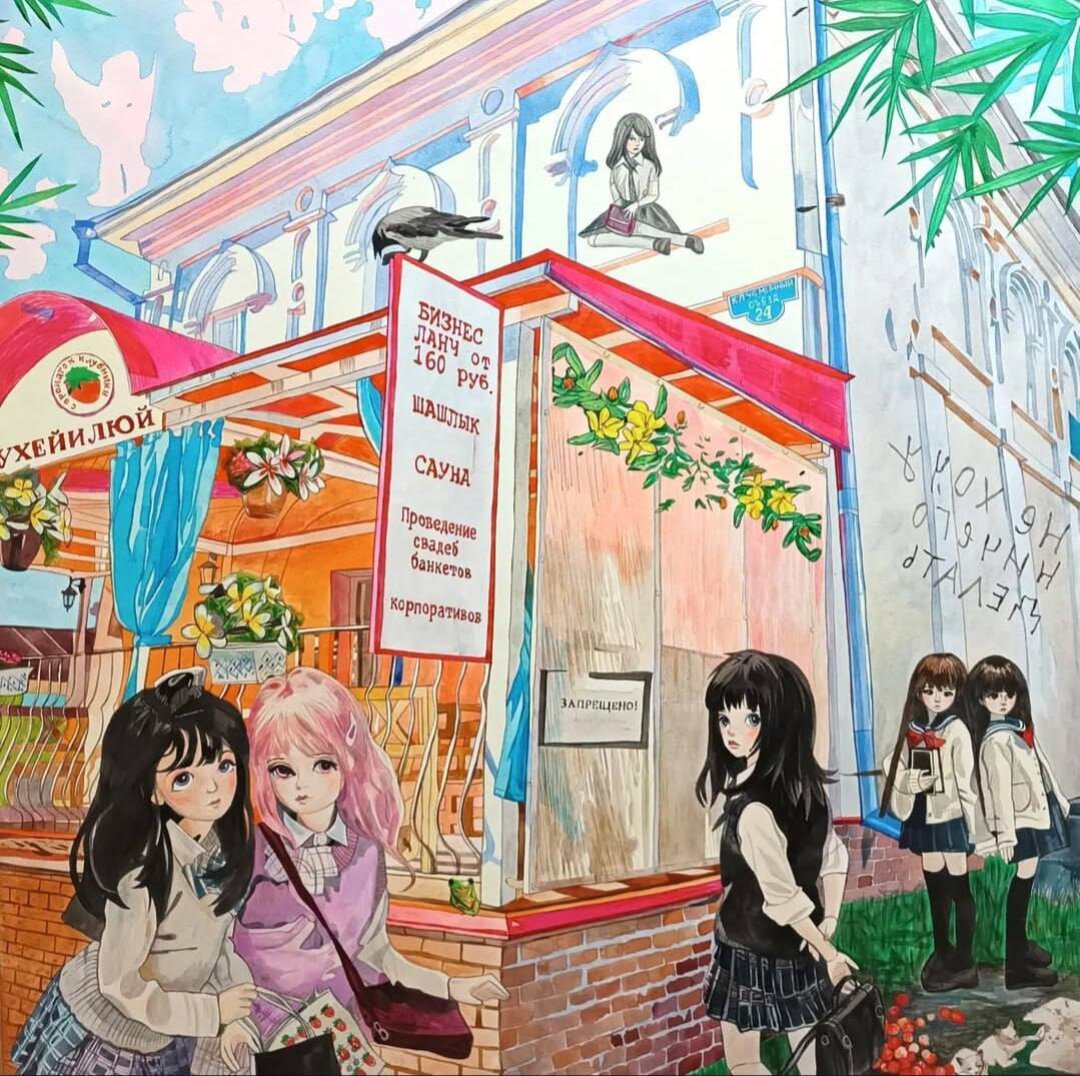 Художница Галереи 9Б, которая пишет сюрреалистические портреты с мемами и «сочетает несочетаемое» (анимэ и нижегородскую архитектуру, например).
