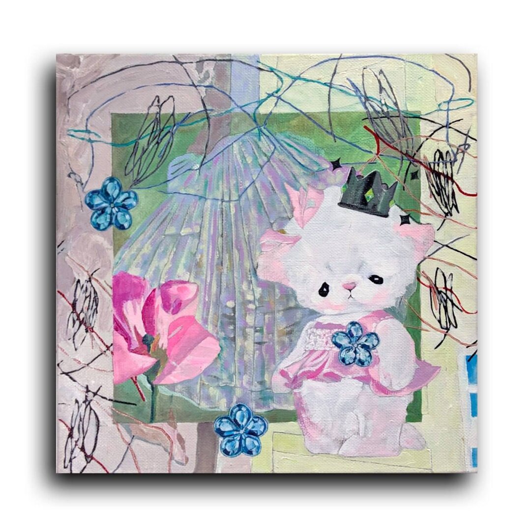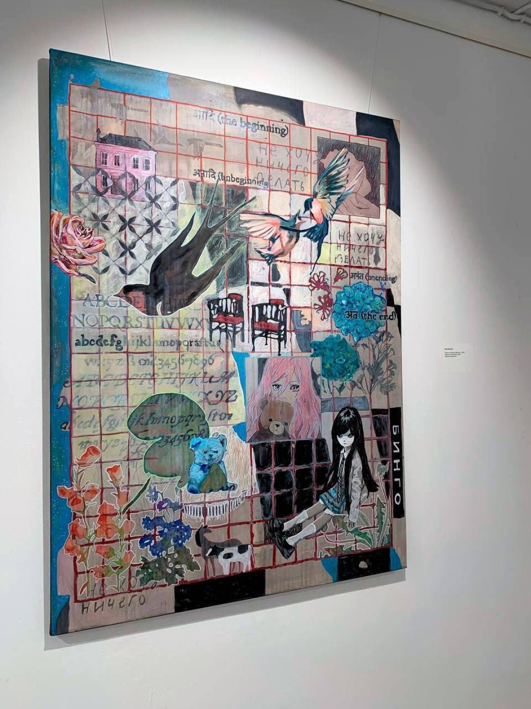 Мне нравится сочетать несочетаемое. Я очень люблю находить какие-то точки соприкосновения, наслаивать тексты, картинки из интернета, фотографии бытового характера. Меня вдохновляет рождение новых неожиданных смыслов от слияния нескольких сущностей, например, интернета и реальной жизни. Мой основной медиум – живопись акрилом на холстах, бумаге, иногда на дереве или ткани. Мне нравится универсальность этой краски и то, что она быстро сохнет, потому что я не люблю ждать, а акрил дает мне возможность делать бесконечное количество слоев. Сейчас у меня в разработке серия графических работ, хочу попробовать акварель, последний раз ей рисовала еще в художественной школе.