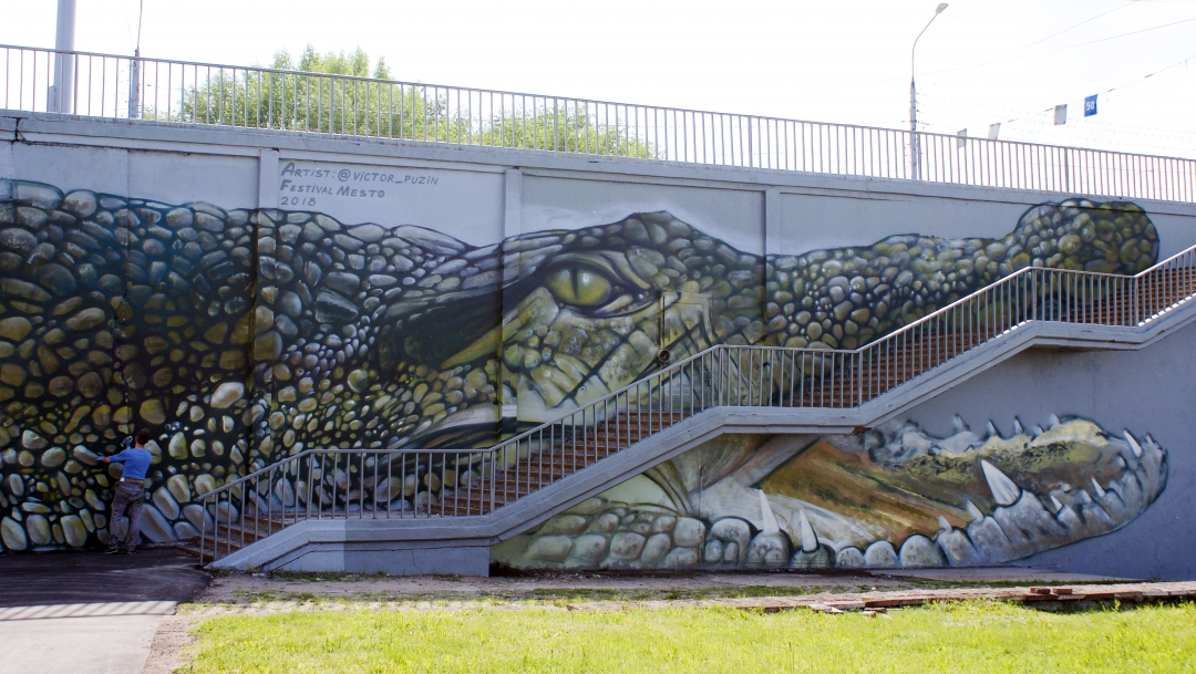 Картина появилась еще в 2006 году. Она располагалась на том же месте, где и сейчас, в самом начале Канавинского моста. Потом переправу стали ремонтировать и картину закрасили. Когда я готовил лекцию, посвященную истории нижегородского стрит-арта, подумал, как было бы здорово восстановить рисунок. Тогда же написал одному из авторов, художнику Виктору Splash'у. Он живет в Санкт-Петербурге и до сих пор занимается уличным искусством. Виктор согласился приехать и вернуть “Крокодила” под эгидой фестиваля. Теперь у рептилии есть не только голова, а еще и тело, лапы, хвост: сама форма моста подсказывает такой рисунок. На мой взгляд, получилось масштабно.