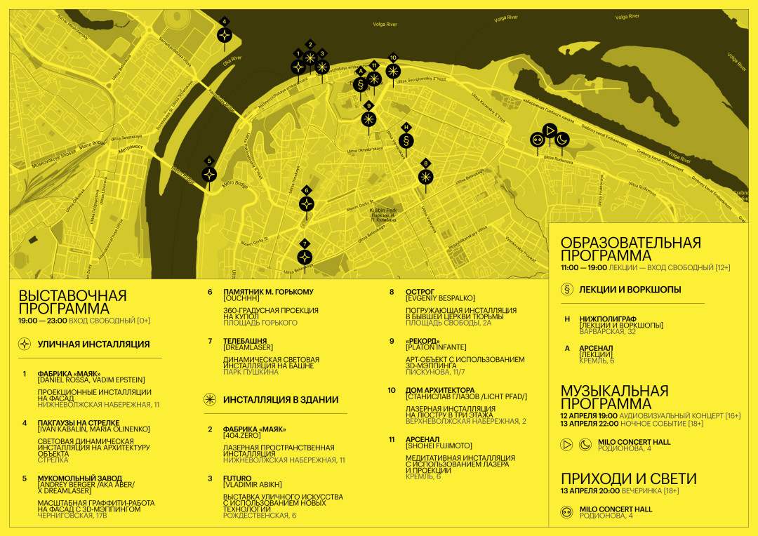 Архитектурное наследие семейства Рукавишниковых стало ключевым объектом фестиваля. Инсталляцию на фасаде «Маяка» представят два совершенно разных художника, которые работают с 3D-мэппингом. Daniel Rossa больше склонен к экспериментам и аналитическому взгляду на эстетическое восприятие, через творчество восстанавливает связь между цифровым миром и реальностью. Вадим Эпштейн в последние годы интересуется генеративной графикой и арт-программированием (creative coding), образной эстетикой с высоким воздействием на зрителя, характерным для постиндустриальных культур.