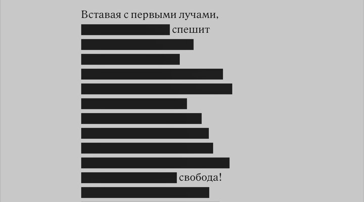 Наличие черного закрытия в книге было исходным условием. Был еще вариант сделать затемнения полупрозрачными, чтобы можно было заглядывать за запрет и читать Пушкина в оригинале, но в этом случае читатель получает слишком много свободы, которая сегодня может быть опасной. Так что для блага самих же читателей блэкаут строго черный, классический.