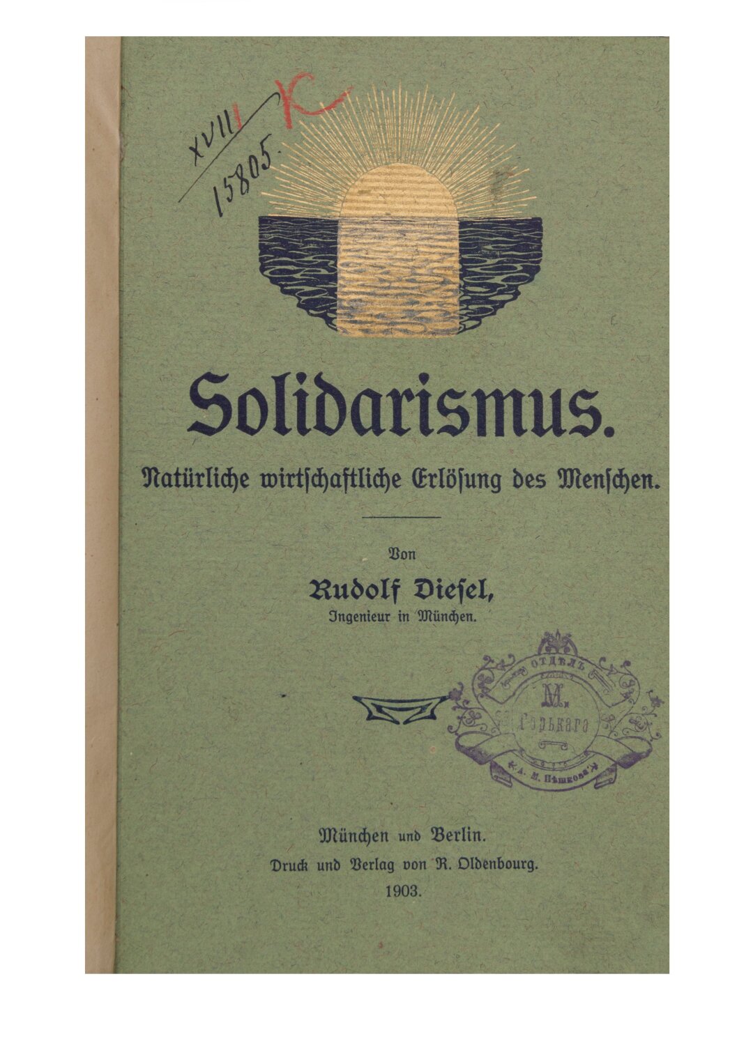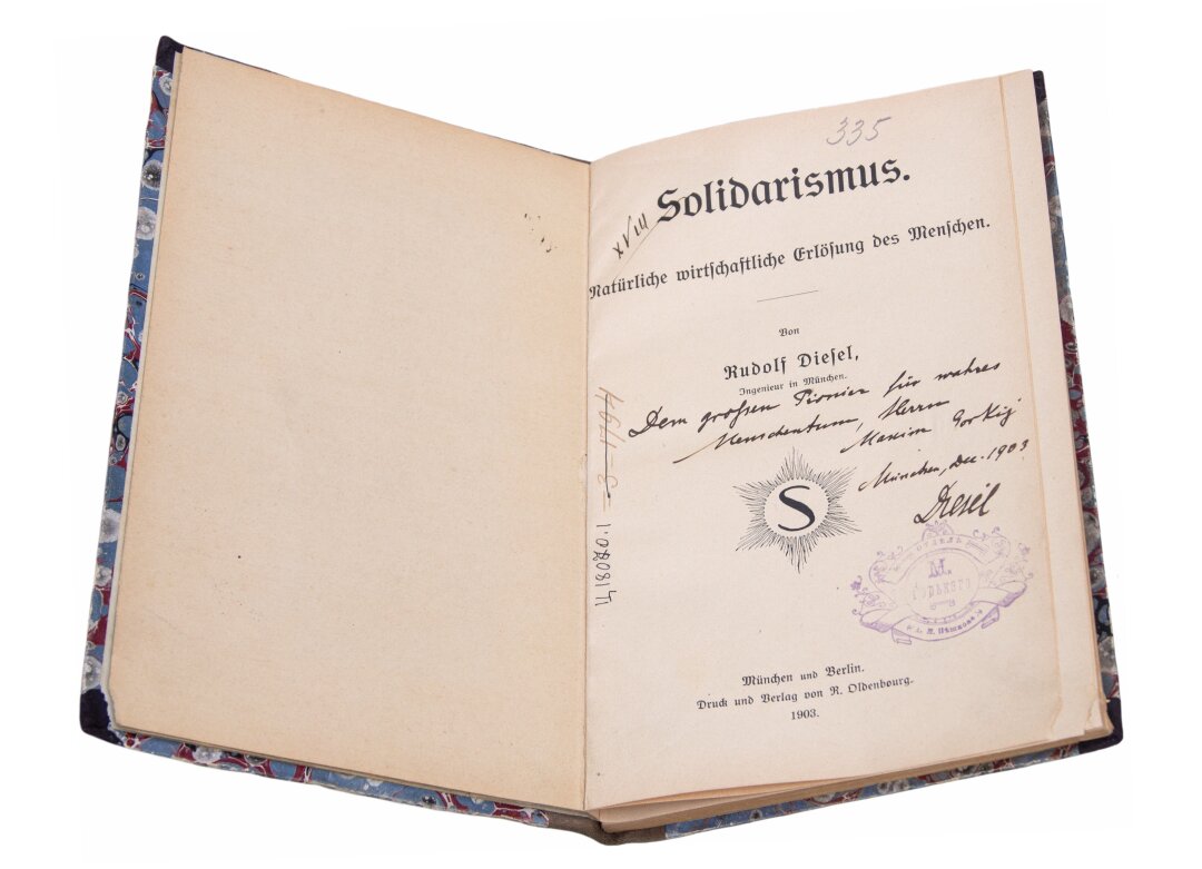 «Великому первопроходцу за неподдельную человечность господину Максиму Горькому. Мюнхен. Декабрь 1903. Дизель» – такую надпись оставил известный инженер, изобретатель двигателя внутреннего сгорания Рудольф Дизель (1858-1913) на титульном листе своего издания «Солидарность. Естественное экономическое освобождение человека». Факт личного знакомства этих двух людей не подтвержден, однако известно, что они знали о существовании друг друга, взаимно восхищались талантом и разделяли некоторые идеи.