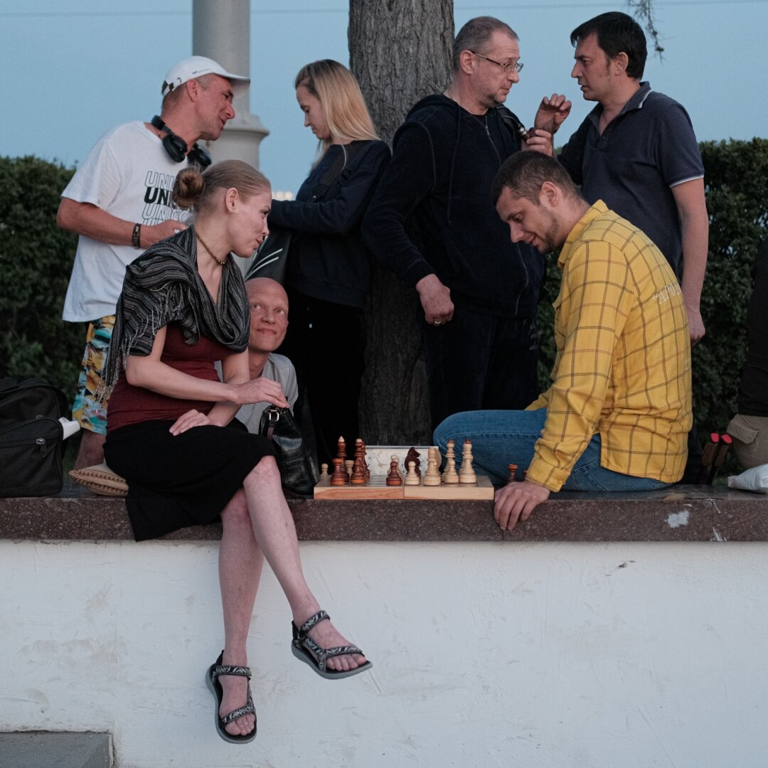 Самое замечательное — когда жизнь отвечает на твои фотографические поиски гармонично складывающейся композицией, игрой переднего и заднего планов. Наверное, мой самый любимый снимок — с екатеринбургскими шахматистами. Я каждый вечер приходил на Плотинку поснимать шахматистов, но каких-то интересных кадров не случалось. Но вот спустя неделю в итоге сложилась картинка — такой внезапный ренессанс. Девушка просто проходила мимо в пятничный вечер и решила присоединиться к игрокам. Фото потом завирусилось в соцсетях, мне написала героиня снимка и поблагодарила за него.