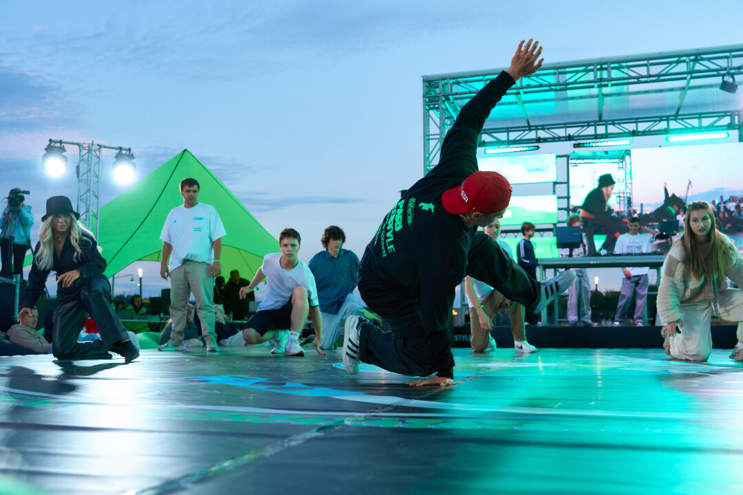 Пройдя два километра вдоль стадиона, доходим до Стрелки и начинаем осматривать наши владения на следующие несколько часов: на мейне диджей греет толпу, состоящую из молодой пары с танцующим не в такт ребенком, а на электронной сцене разминаются танцоры (там пройдут соревнования по брейкингу). По соседству в пуфиках растекаются тусовщики, копящие силы на вечер, а рядом ЗОЖ-маньяки постигают основы джампинга (групповая кардиотренировка на специальном батуте. – Прим. Редакции)