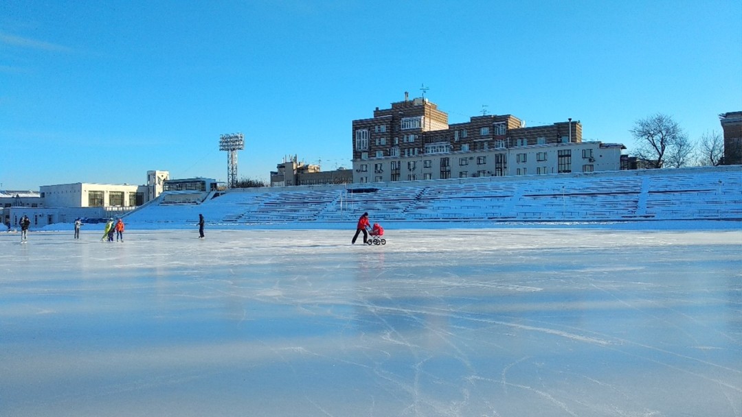 Большой стадион в поселке Сортировочный зимой превращается в крупный открытый каток с естественным льдом. Не ищите здесь особых изысков – только лед, морозный воздух и вы. И этого, поверьте, достаточно!