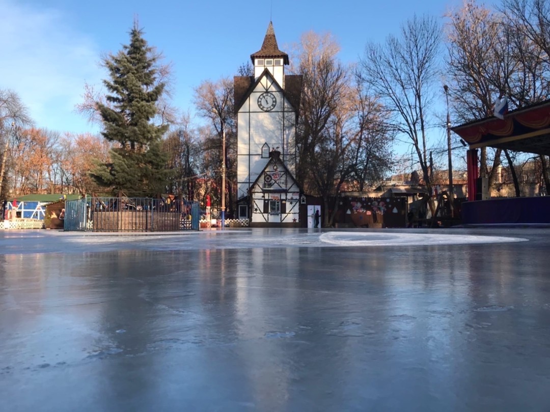 Главная особенность площадки в Парке имени 1 мая – залитые льдом прогулочные дорожки. Гости могут, не снимая коньков, прогуляться по аллеям и покачаться на качелях. Тем, кто неуверенно стоит на коньках, помогут инструкторы.
