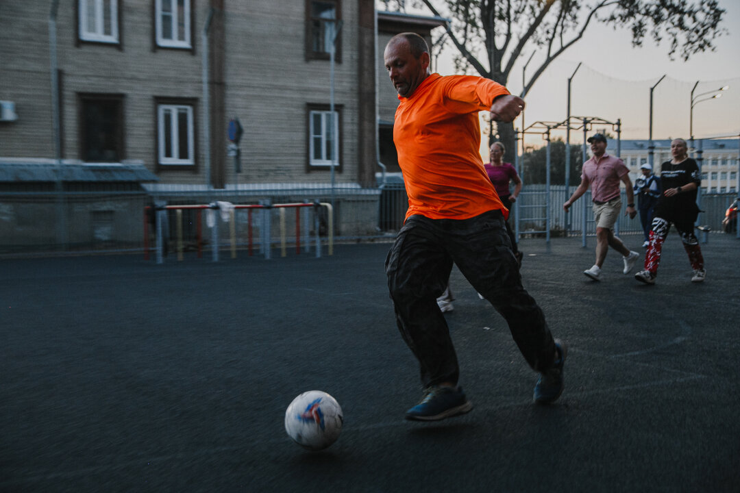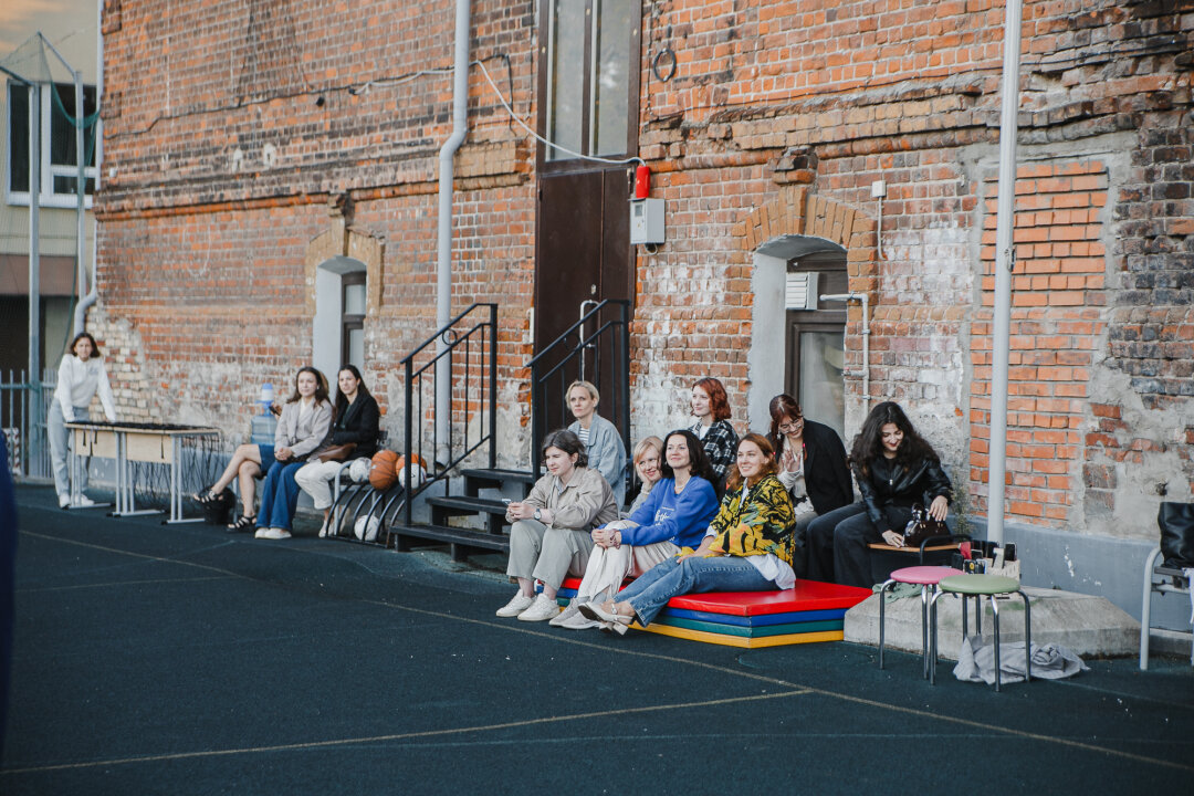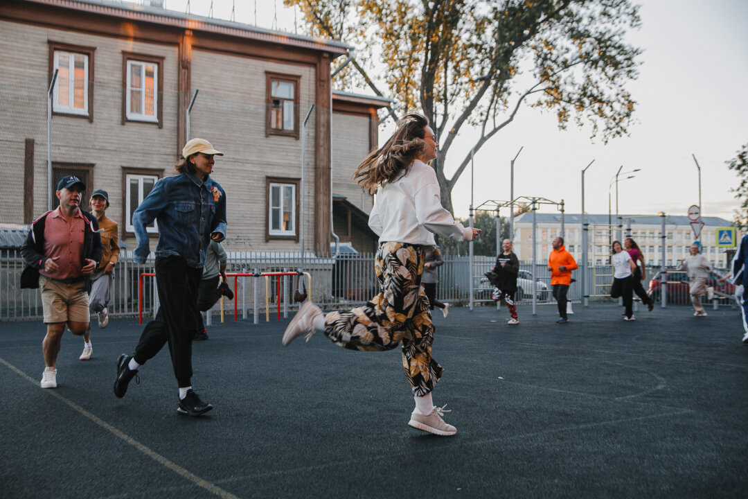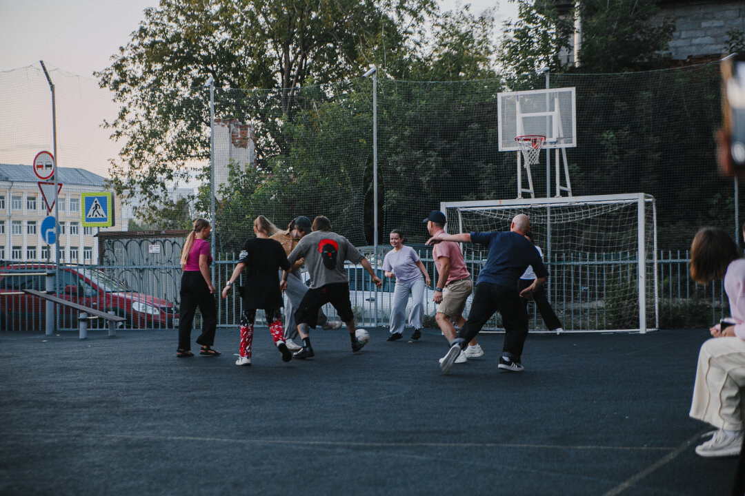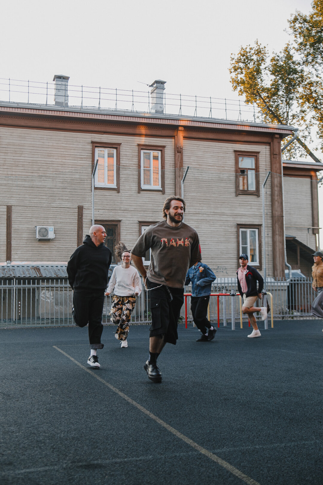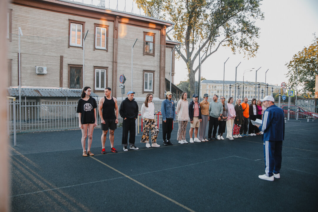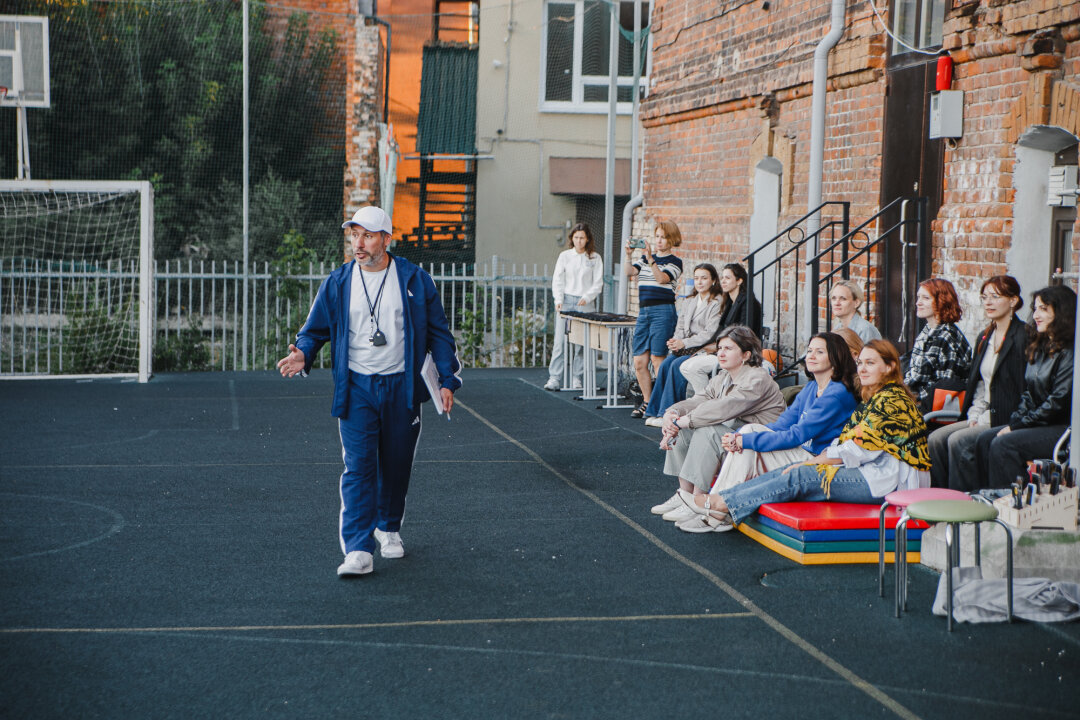Начали спортивно (ведать не ведали, что таким пируэтам учат в театральном) на «Физ-ре» Дмитрия Мулькова. Мы, конечно, знали, что в партиципаторном спектакле зритель принимает активное участие, но к полноценной разминке с приседаниями, пробежкой и футболом были готовы не то чтобы все.