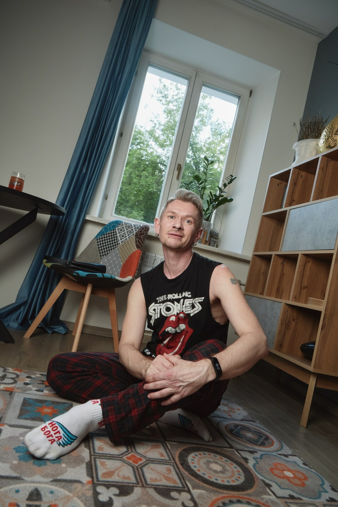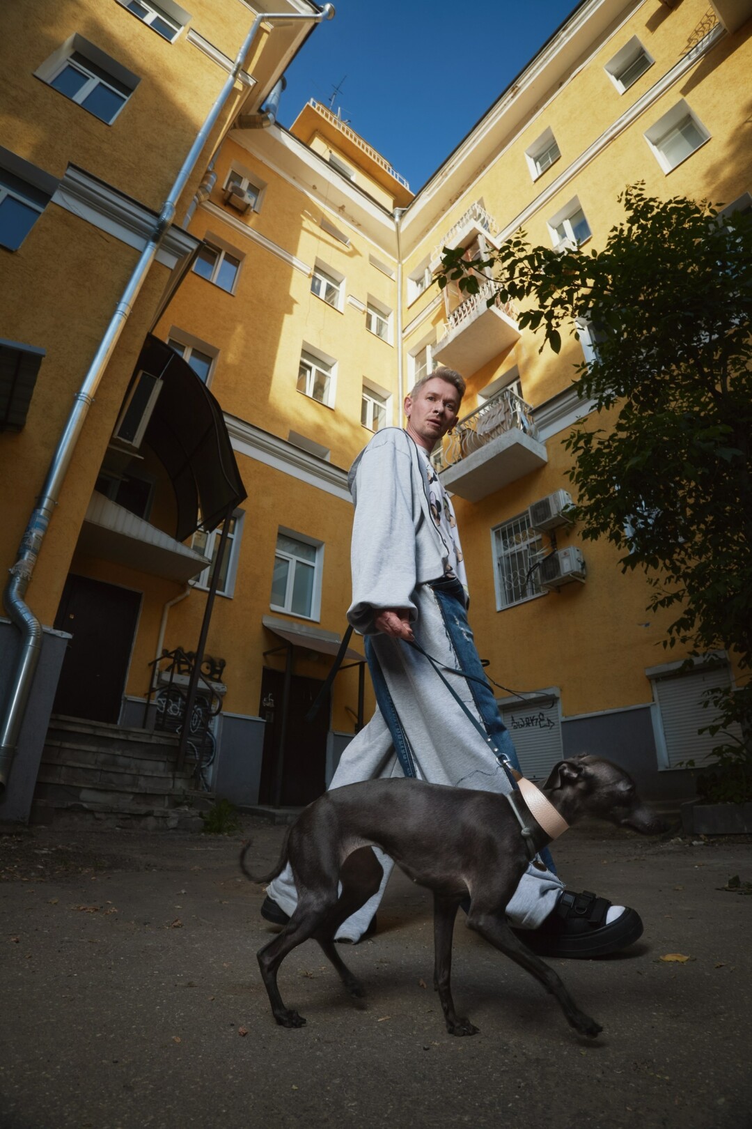 «Пока я жил в панельке, был нудистом – очень любил ходить по квартире голышом. Но, переехав в сталинку, стал чувствовать себя неуютно без одежды под лепными потолками в 3,7 метра. Для дома выбираю комфортные наряды, в которых мне не стремно выйти на улицу – все немножко рок-н-ролл. Домашняя одежда максимально отражает меня расслабленного.