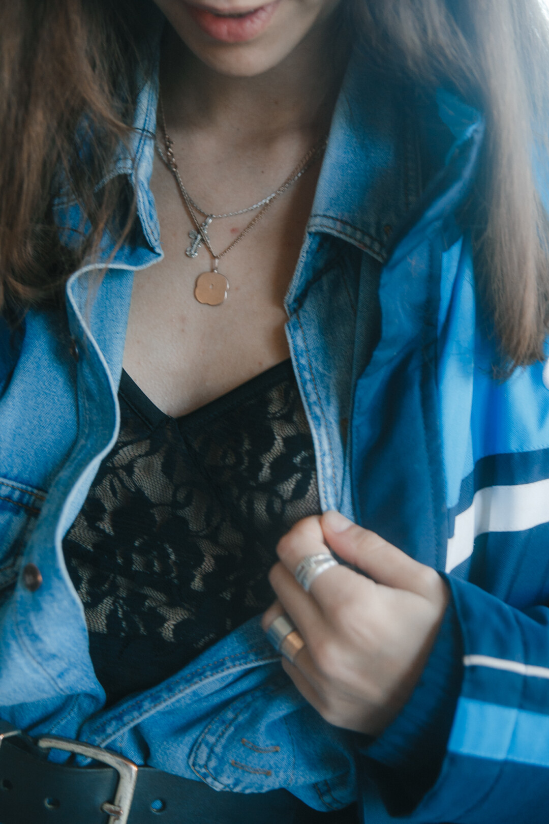 Родственную душу опознали по смелому украшению в ушах от Гоши Rushev (Филипп Бедросович одобряет и, видимо, даже слегка в доле), кстати, точно такая же красуется на всеслышащем ухе нашего digital-редактора. Продюсер Катя играет с винтажем на уровне Кендалл Дженнер – тотал джинс прямиком с показа Ralph Lauren прекрасно уживается с папиной курткой и ажурным топом. Как и полагается завсегдатаям кофеен на главной улице города – эклектично, многослойно, лайкоемко.