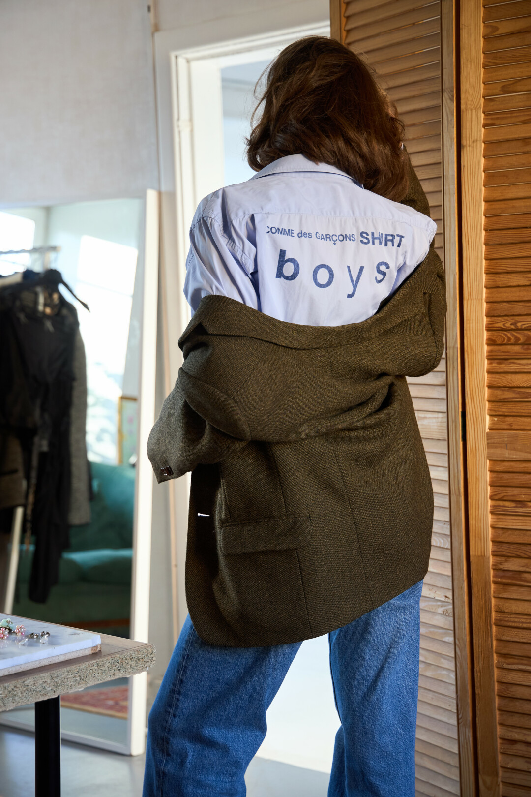 Мой базовый образ всегда строится вокруг пиджака. Этот, конечно, из моего магазина Brumetage. Под ним любимая рубашка Comme des Garçons – мне ее подарил мужчина на свидании. Я была в Москве, мне не в чем было пойти на вечеринку, и он принес ее! Мы больше не виделись, а я теперь ношу рубашку не снимая. Внизу джинсы Zara и итальянские казаки из телячьей кожи. Сапогам семь лет, но они в безупречном состоянии. Пальто из винтажки «Нечего надеть» подходит сюда идеально.