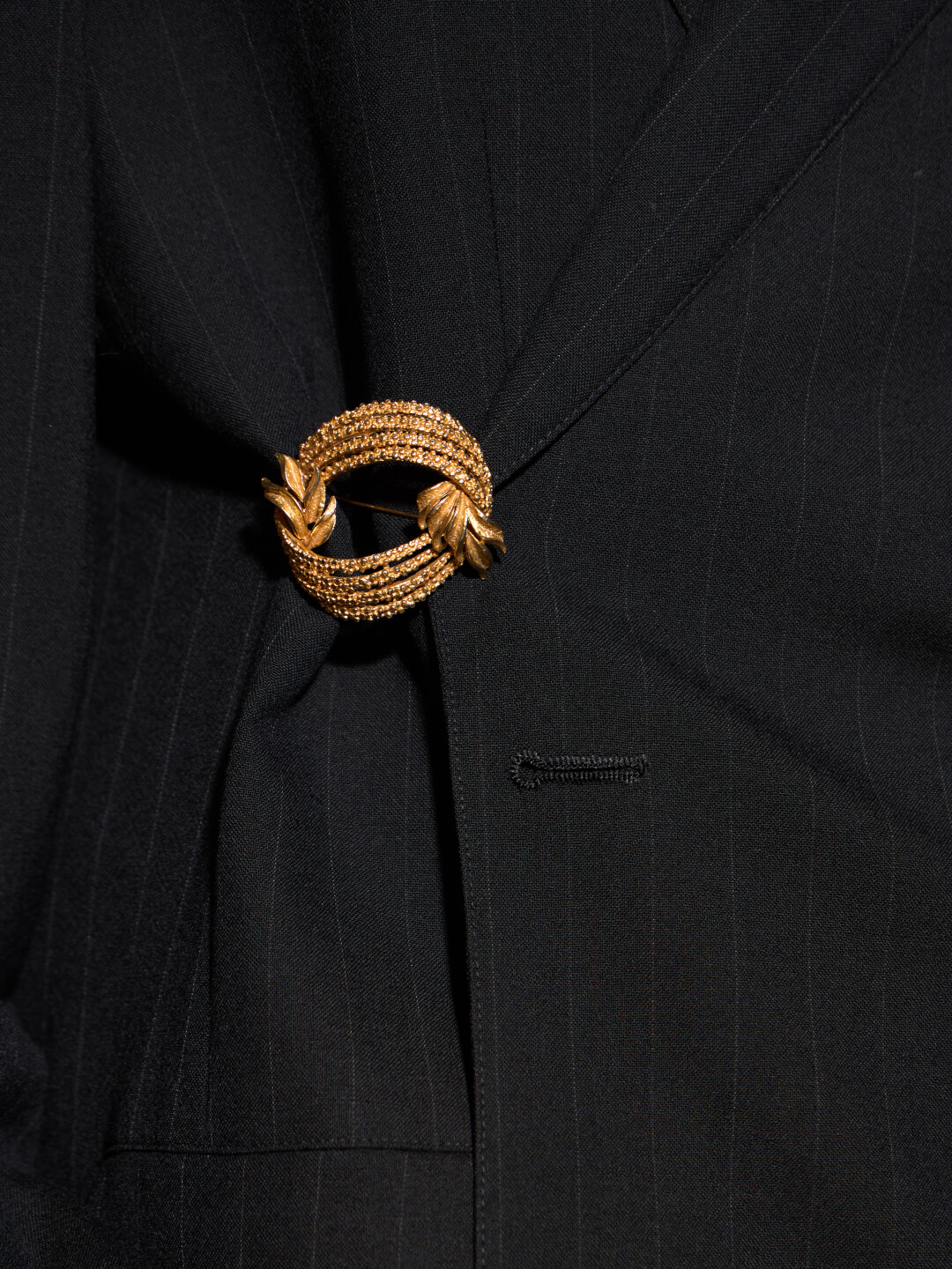 Любимый стилистический прием в последнее время – делать акцентную талию на рубашках и пиджаках с помощью броши. Эта, например, 70-х годов, из США. Раз – и пиджак превращается в платье.