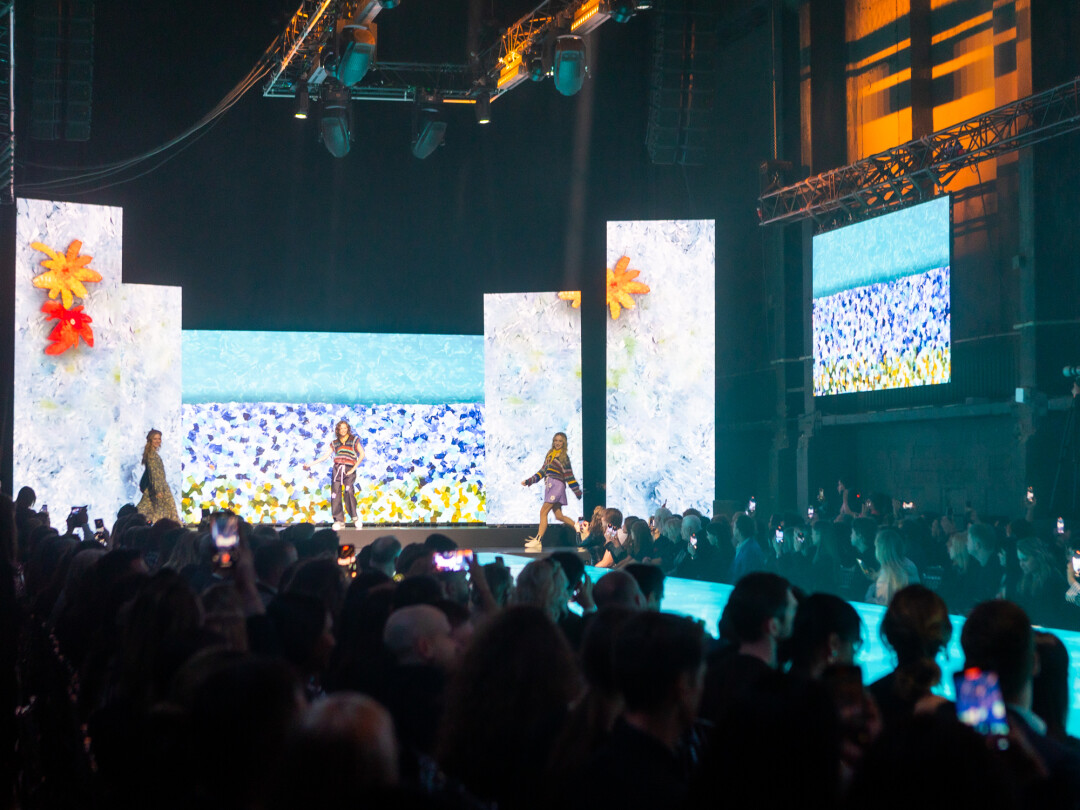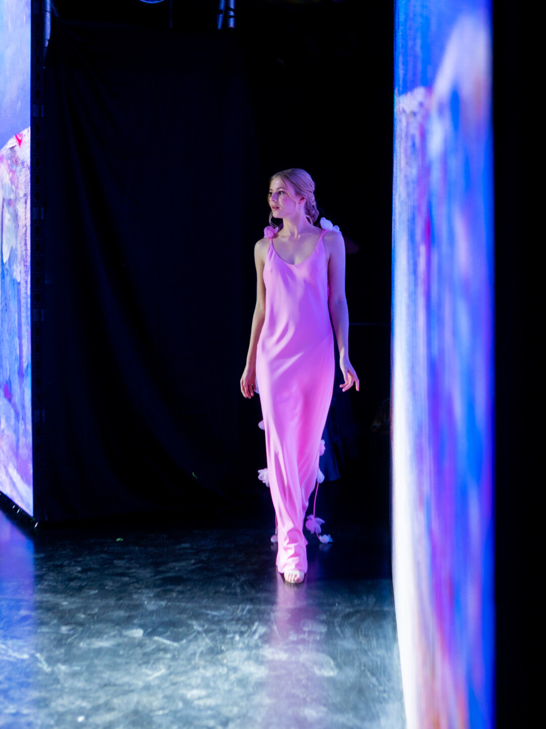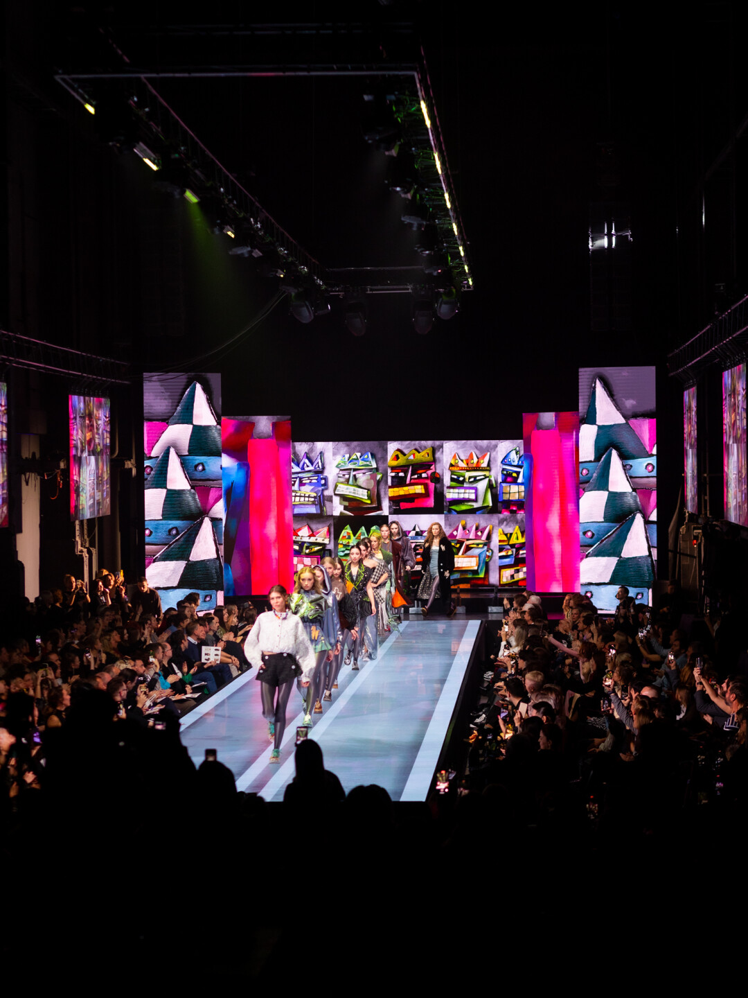 Концепт-дизайнер Дарья Смирнова: «При создании концепции мы тесно взаимодействовали с режиссером шоу и сразу же пришли к общей идее сетапа, который будет напоминать картинную галерею. Использовали простые прямоугольные формы, которые разместили в разных плоскостях ЦЕХа *. Диодный пол, прямоугольный навес света над подиумом, боковые экраны по всей длине и центральная композиция из пяти экранов на сцене позволили нам создать поверхности, на которых выводились произведения искусства. И когда участницы взаимодействовали с ними, они дополняли новым содержанием и красотой уже существующие картины известных художников».