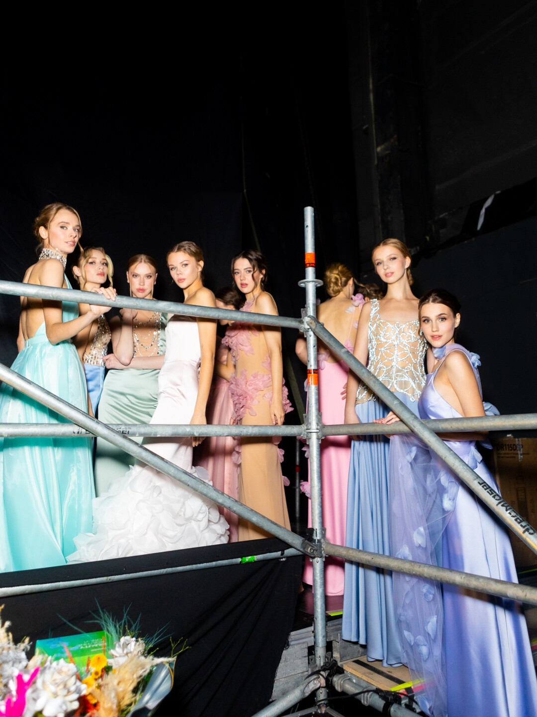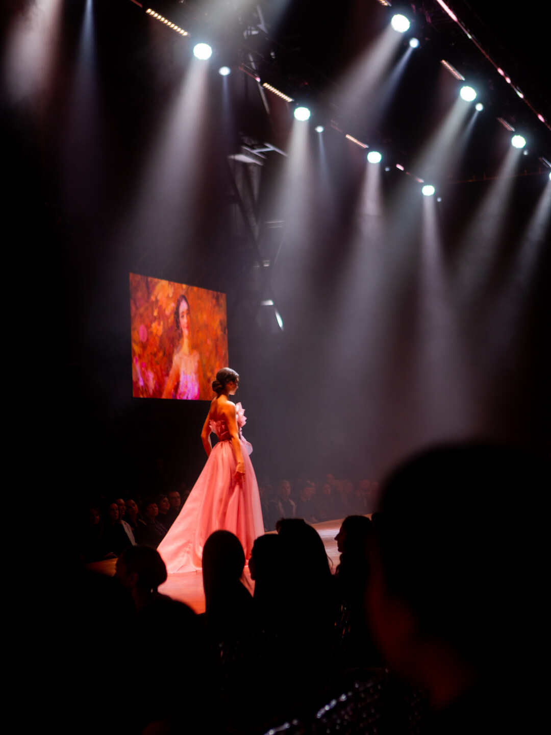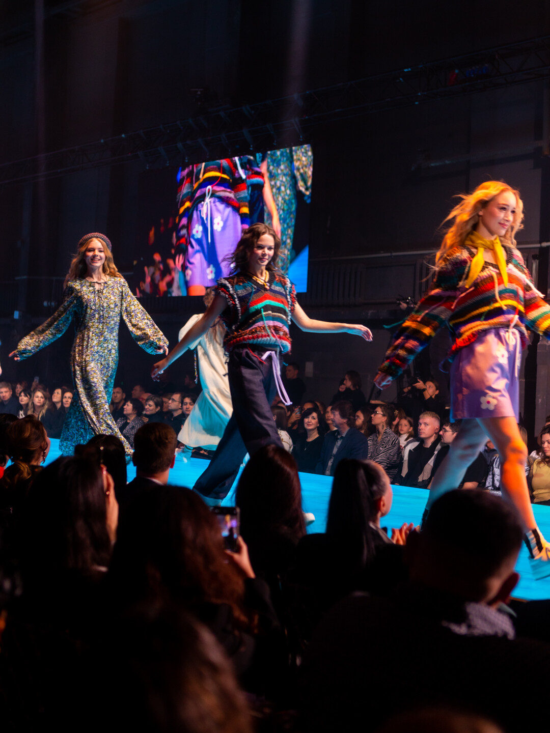 Концепт-дизайнер Дарья Смирнова: «При создании концепции мы тесно взаимодействовали с режиссером шоу и сразу же пришли к общей идее сетапа, который будет напоминать картинную галерею. Использовали простые прямоугольные формы, которые разместили в разных плоскостях ЦЕХа *. Диодный пол, прямоугольный навес света над подиумом, боковые экраны по всей длине и центральная композиция из пяти экранов на сцене позволили нам создать поверхности, на которых выводились произведения искусства. И когда участницы взаимодействовали с ними, они дополняли новым содержанием и красотой уже существующие картины известных художников».