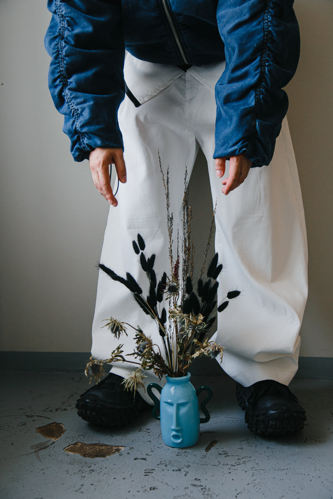 Штаны «Матадор» от российского бренда Chernim Cherno я хотел очень давно, нашел на Авито и получил в подарок от друзей на день рождения. О бомбере я тоже мечтал полгода, но он стоил 210 тысяч. Звучит как хайп, но я нашел свой за 35 тысяч в Familia. На шее колье от Maison Margiela из коллаборации с H&M. В нем я был недавно на премии «ТОП50». А в руках – ваза от моей любимой Кати Ферапонтовой из благотворительного фонда «Время РАСсвета». Я считаю, что было бы круто использовать вазу как аксессуар и ходить с ней по улице.