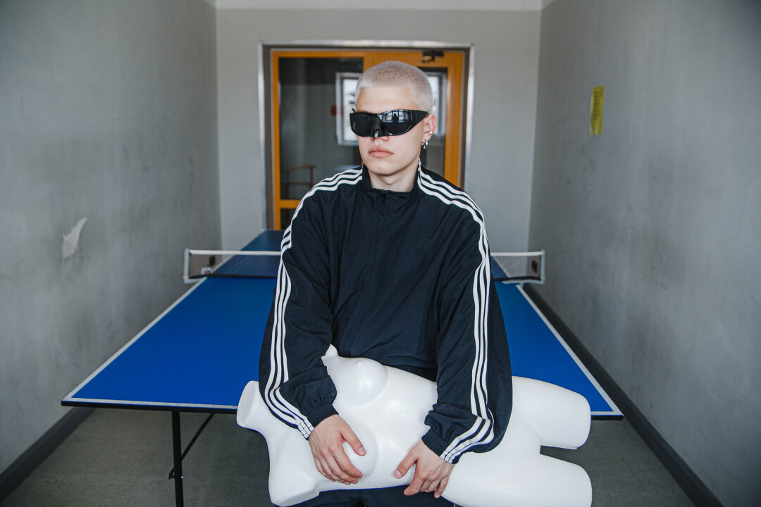 Возможно, это костюм из коллаборации с Канье Уэстом, но что это Adidas я знаю точно. Хоть он и без логотипов, просто три полоски. Толстовка огромная, хотя это размер S. Очки, конечно, баленса, а голая женщина – просто манекен, олицетворяющий мое дело в этом мире.