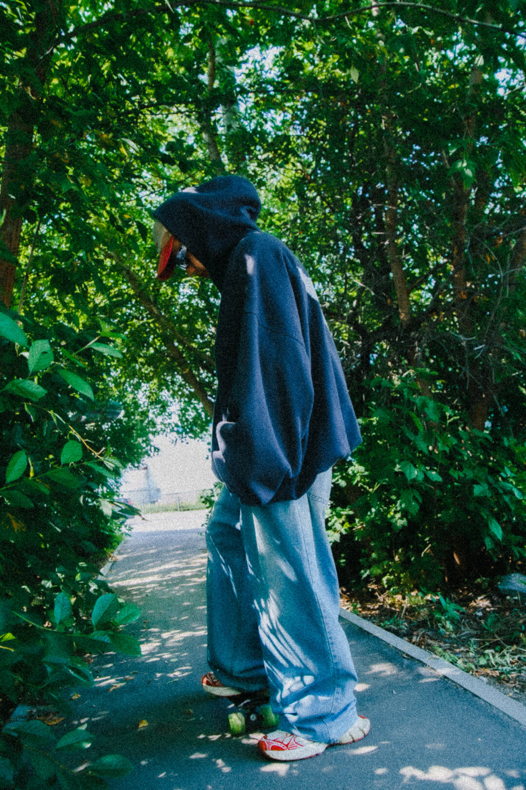 Чаще всего мне хочется скрыться за одеждой, даже если она яркая. Здесь я надел винтажную кепку и очки, которые сигнализирую: «Я еще не привык к избыточную вниманию». Но как бы я ни старался спрятаться за этими баулами (здесь в виде винтажной толстовки Balenciaga), мою натуру утаить невозможно.